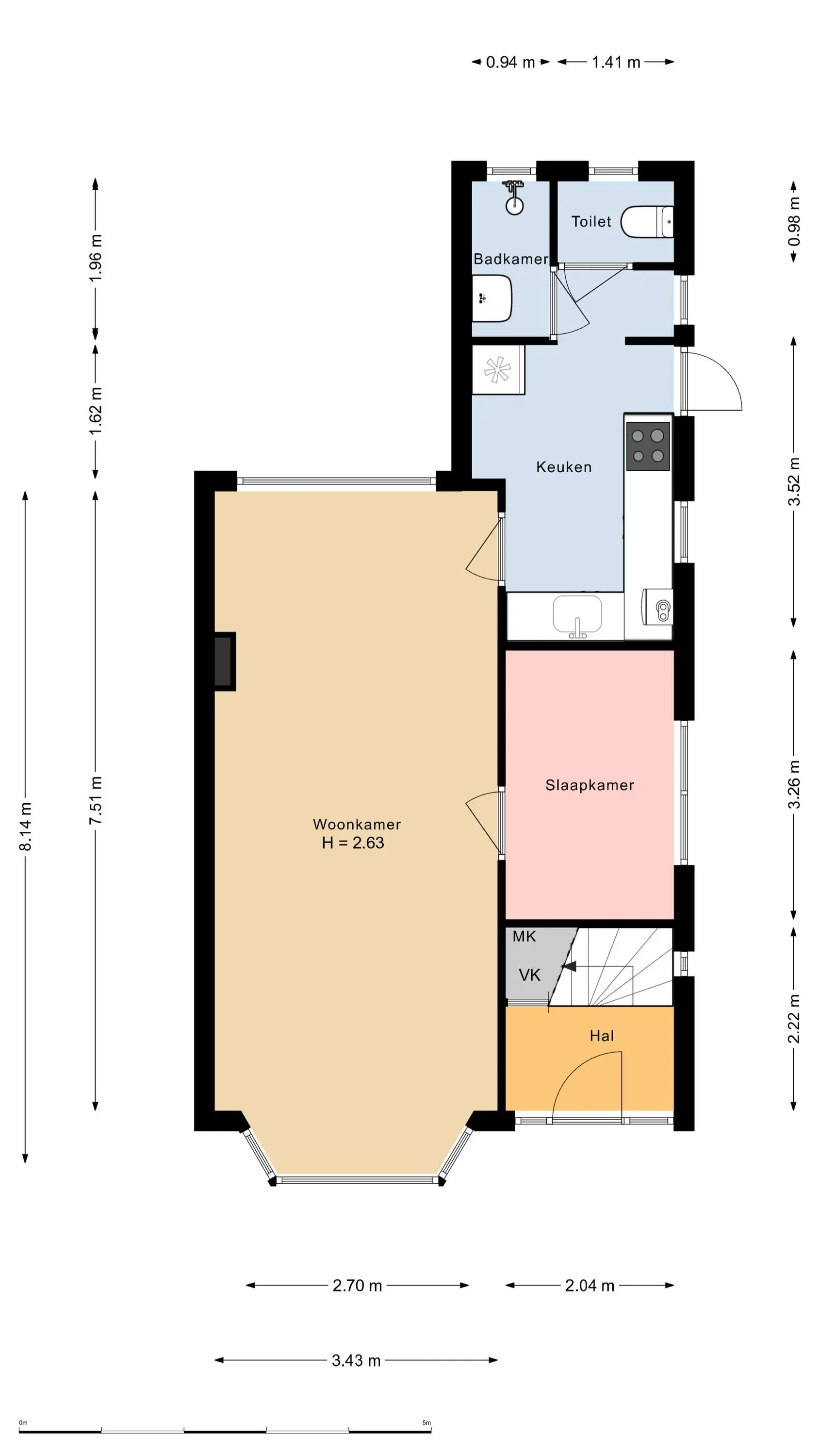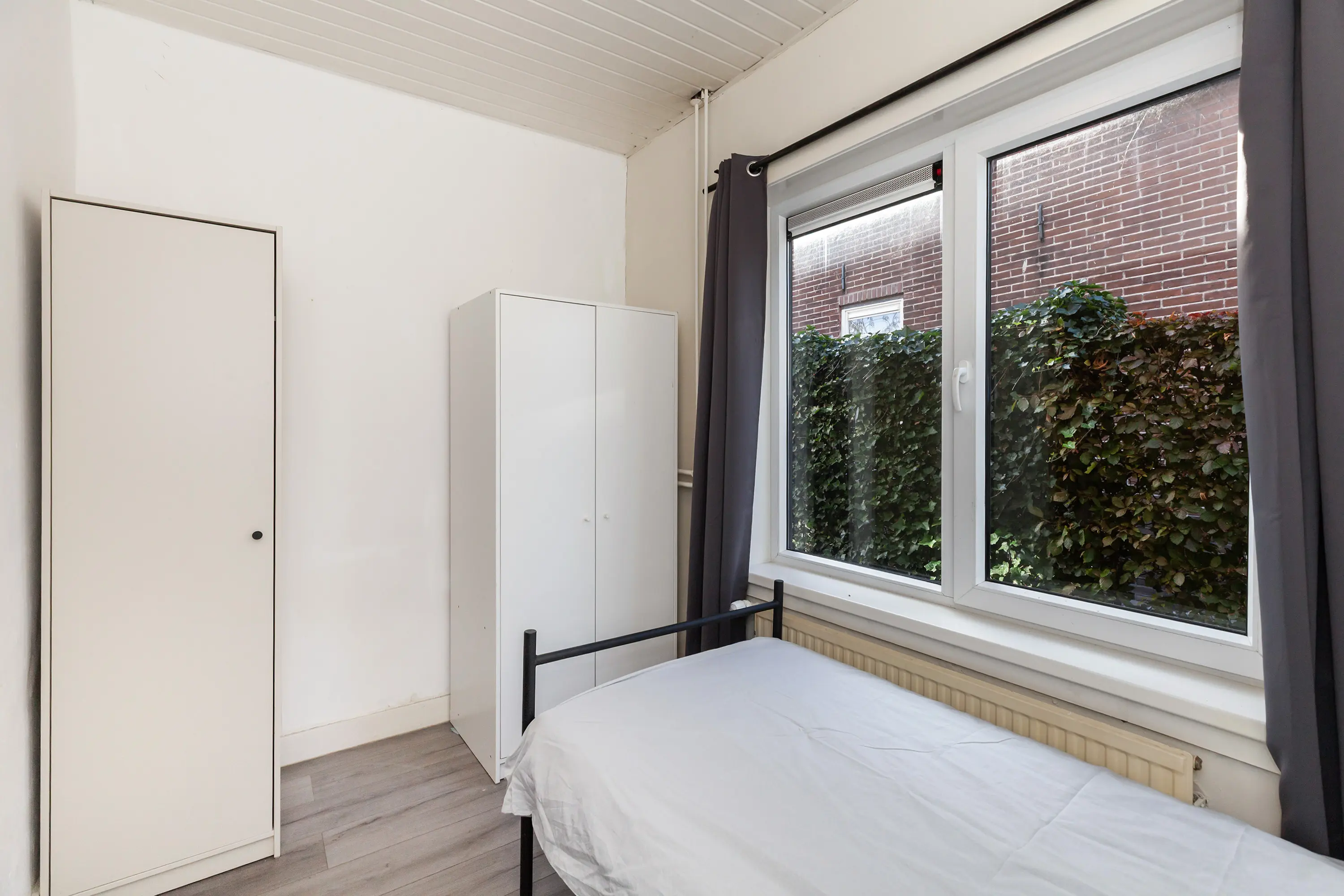 Begane grond: Entree, hal met meterkast en bergruimte, Woonkamer met erker en laminaat vloer, slaapkamer/kantoor, keuken met eigen ingang, badkamer met douche en wastafel en toilet.
