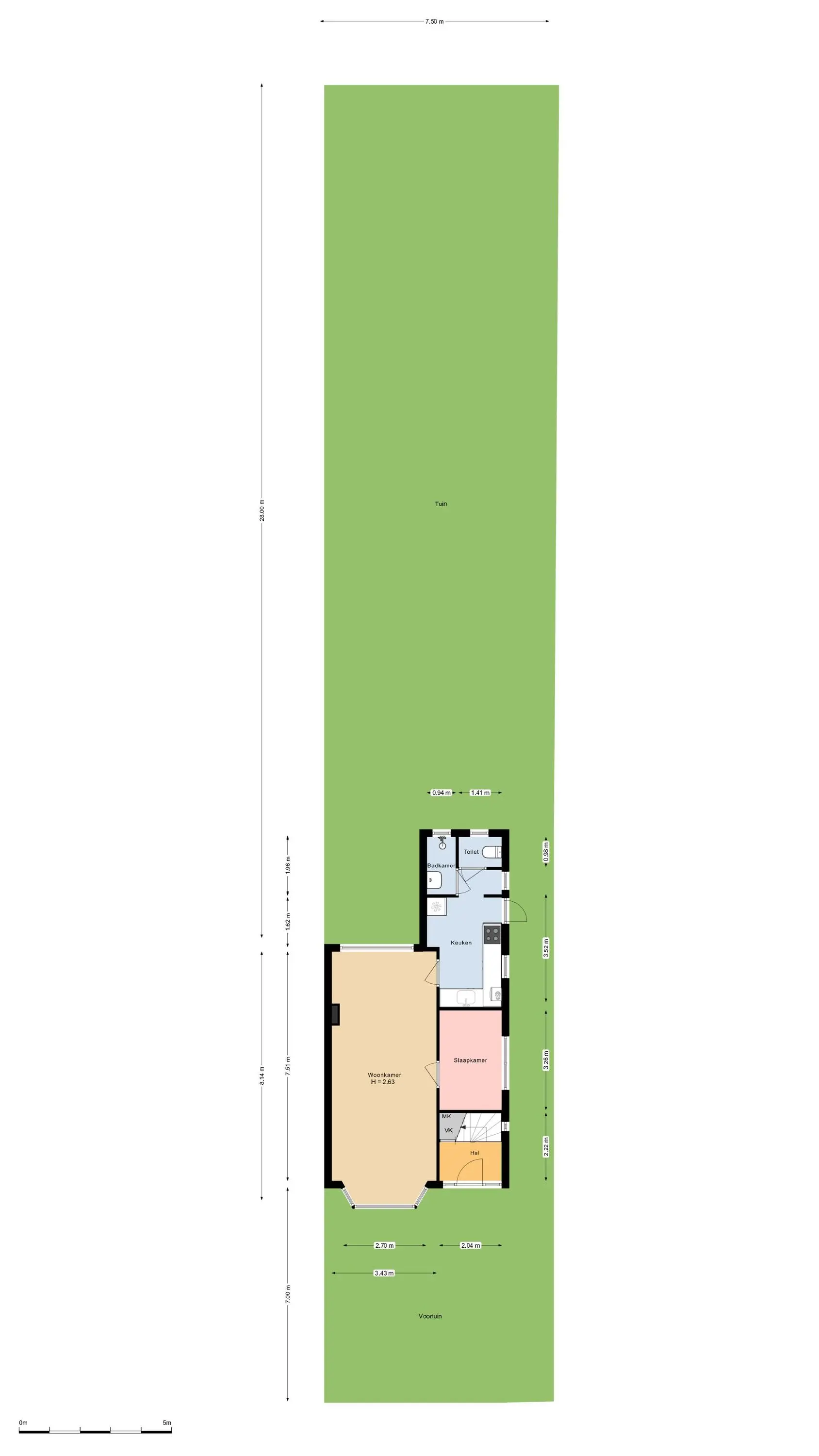 Tuinen: voortuin op het Westen van ca.53m2, achtertuin op het Oosten van ca.210m2, zijpad ca.18m2.