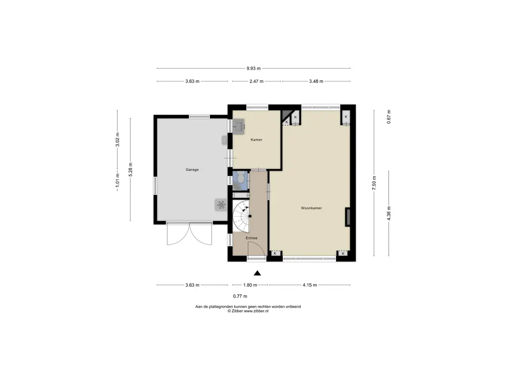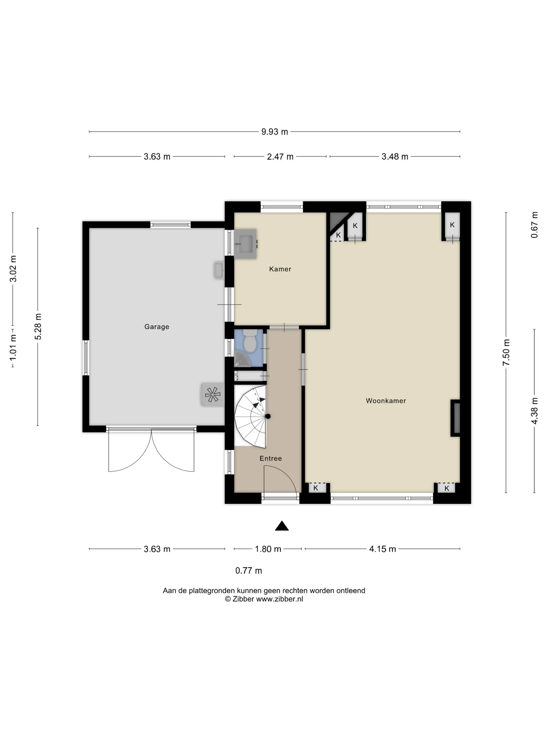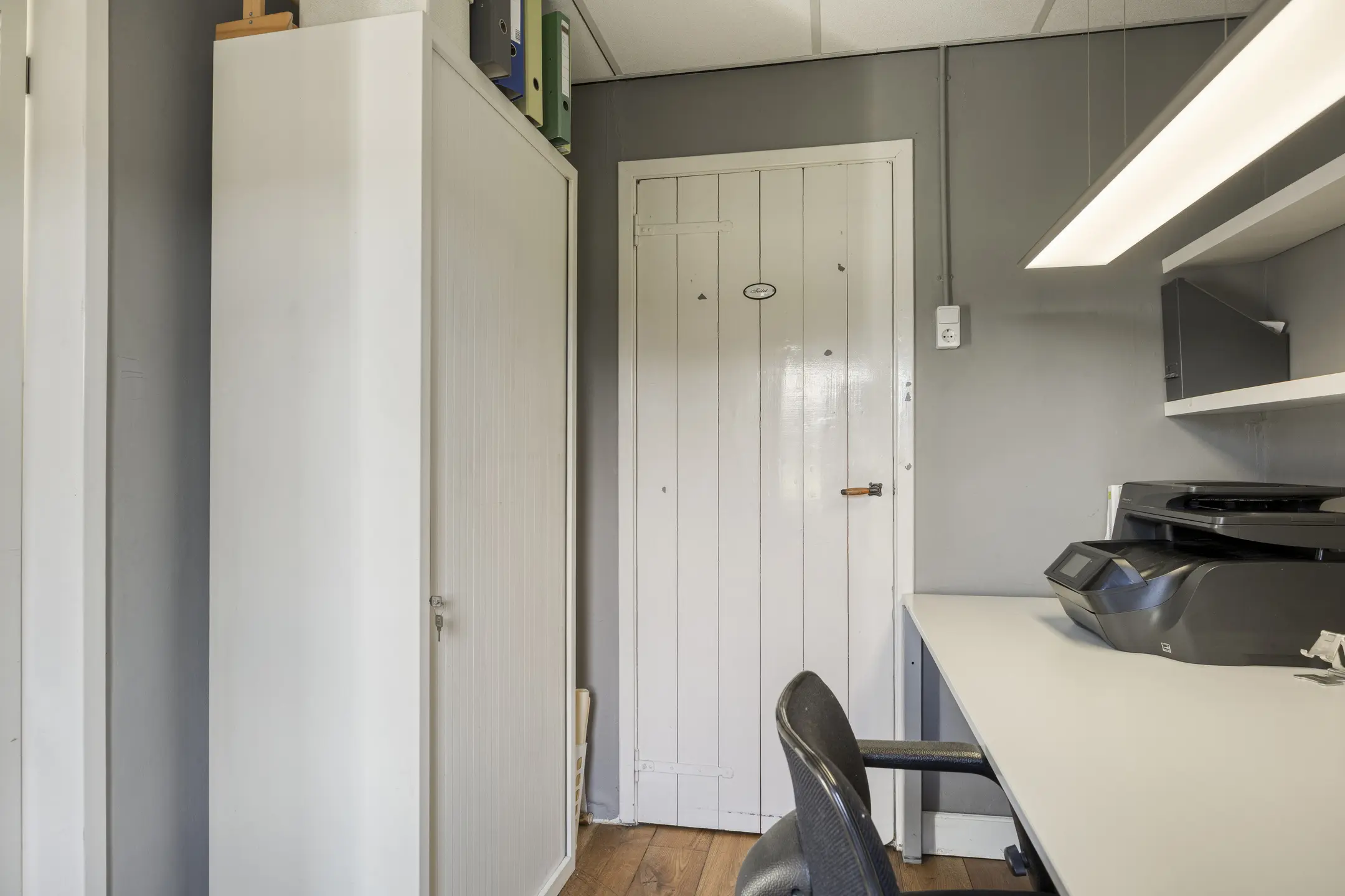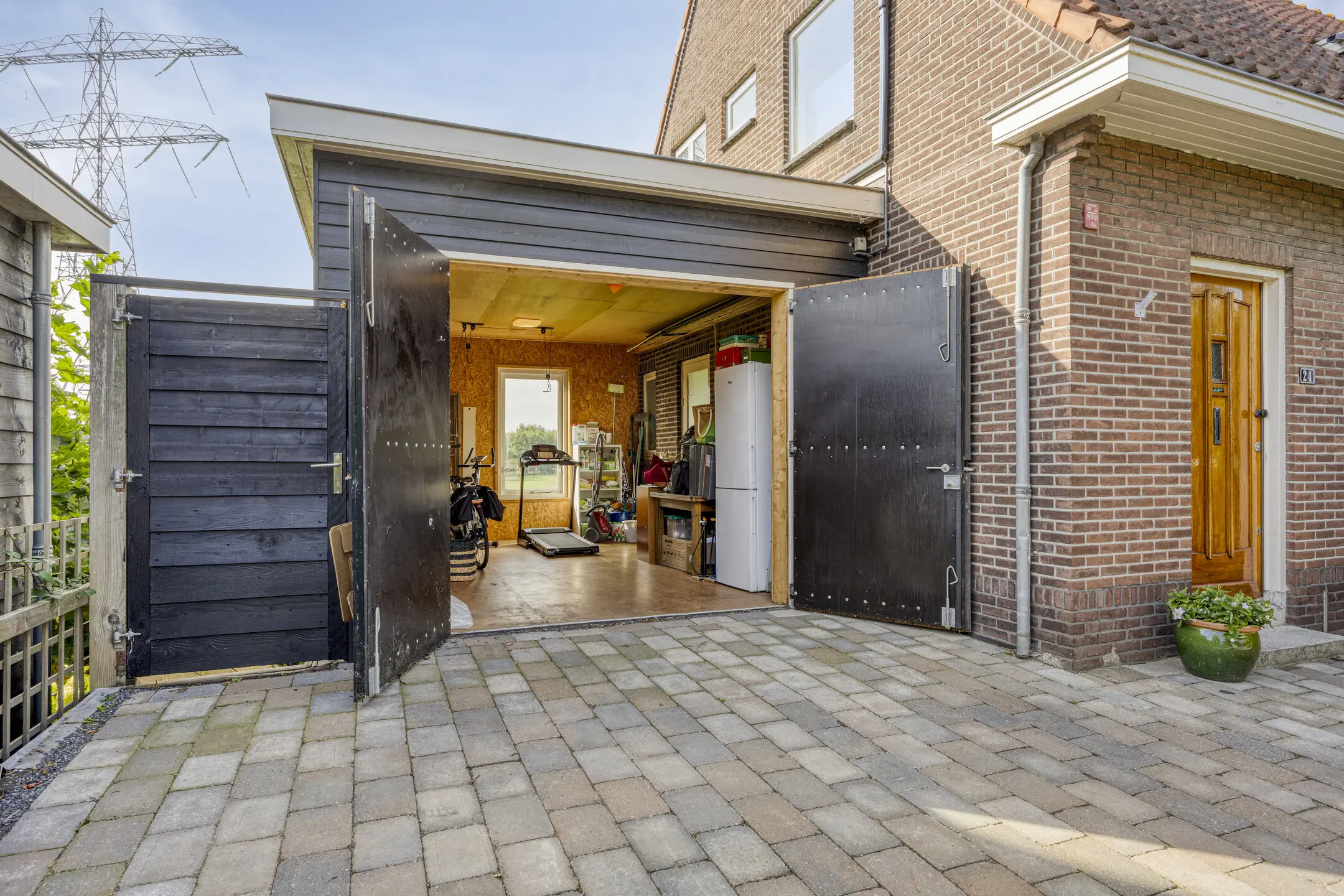 Dijkniveau: entree/hal met toilet, woonkamer met smaakvolle vaste inbouwkasten, tevens een (werk)kamer (voorheen keuken) met de deur naar de naastgelegen garage. De garage is modern gebouwd en voorzien van isolatie, hierdoor ook geschikt te maken als woonruimte.