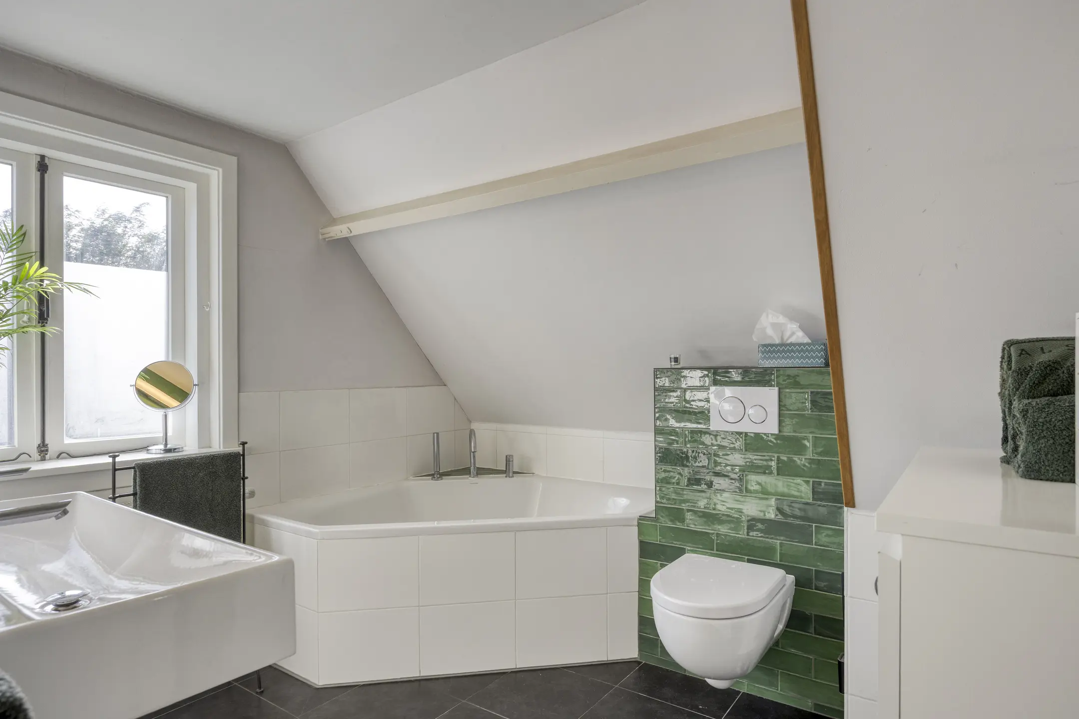 1e verdieping: 2 slaapkamers, balkon, overloop, waskast met tevens bergruimte, bergkast, badkamer met hoekligbad, toilet, inloopdouche en dubbele wastafel.