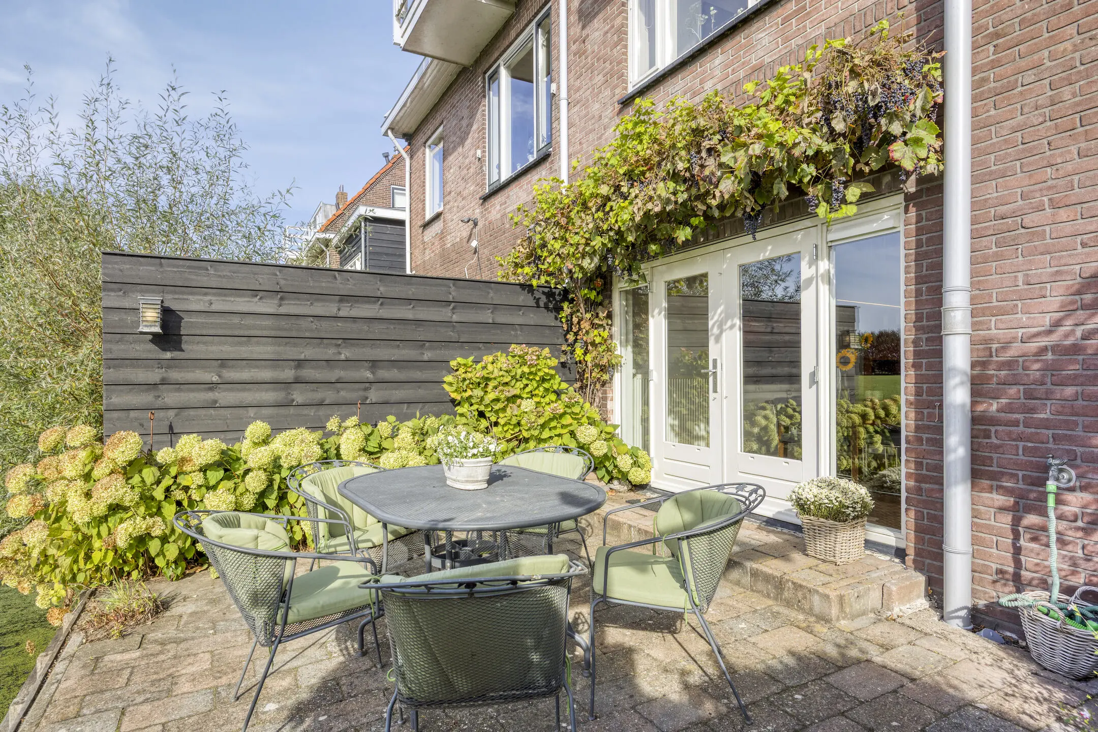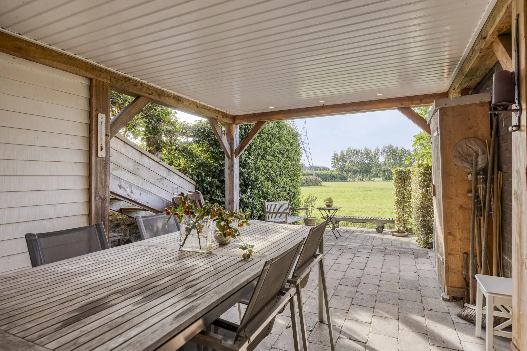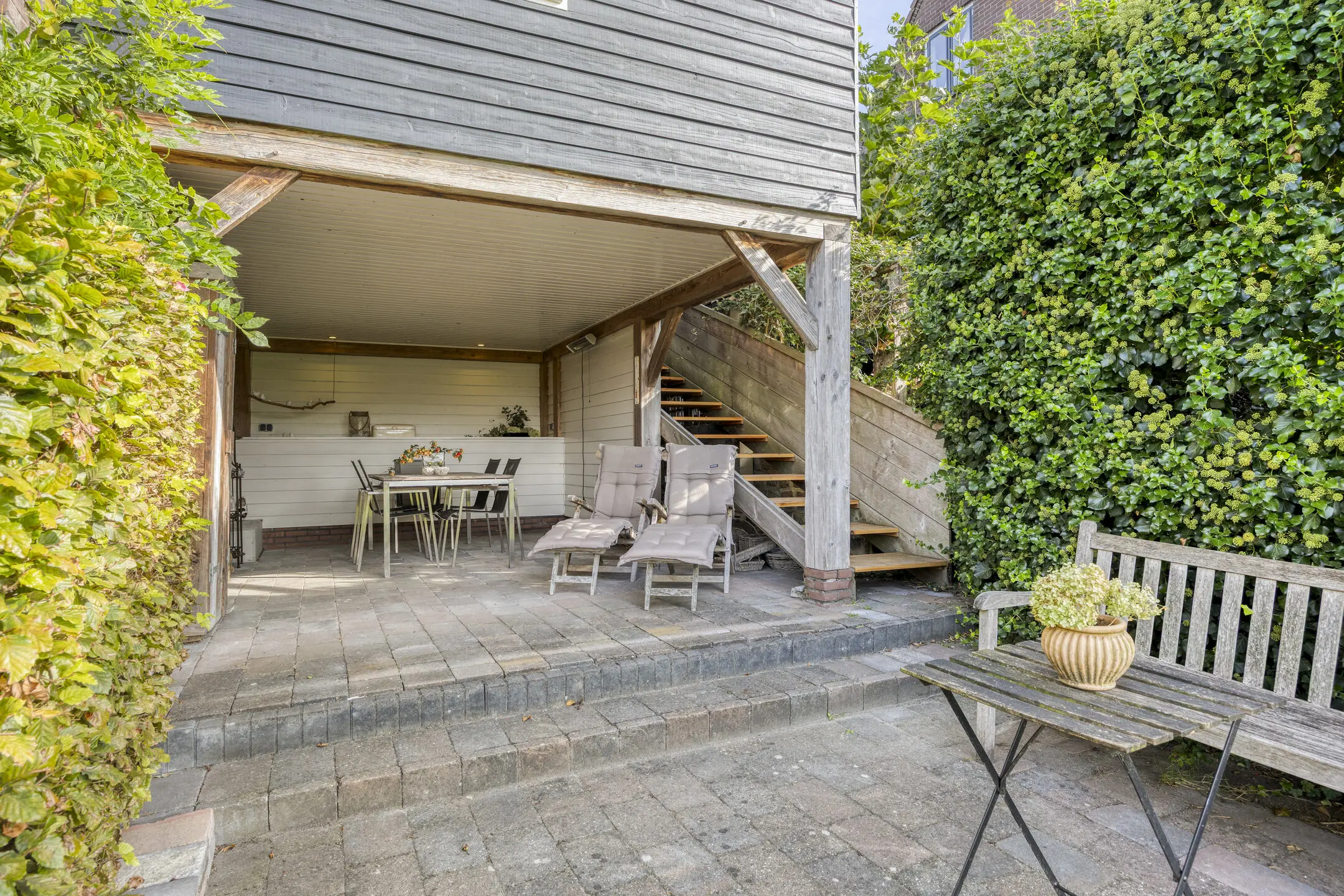 De achtertuin is gelegen op het zuiden en o.m. voorzien van sfeervolle overkapping van maar liefst 23 m2. Aan voorzijde van de woning is een parkeerplaats 'op eigen erf'.