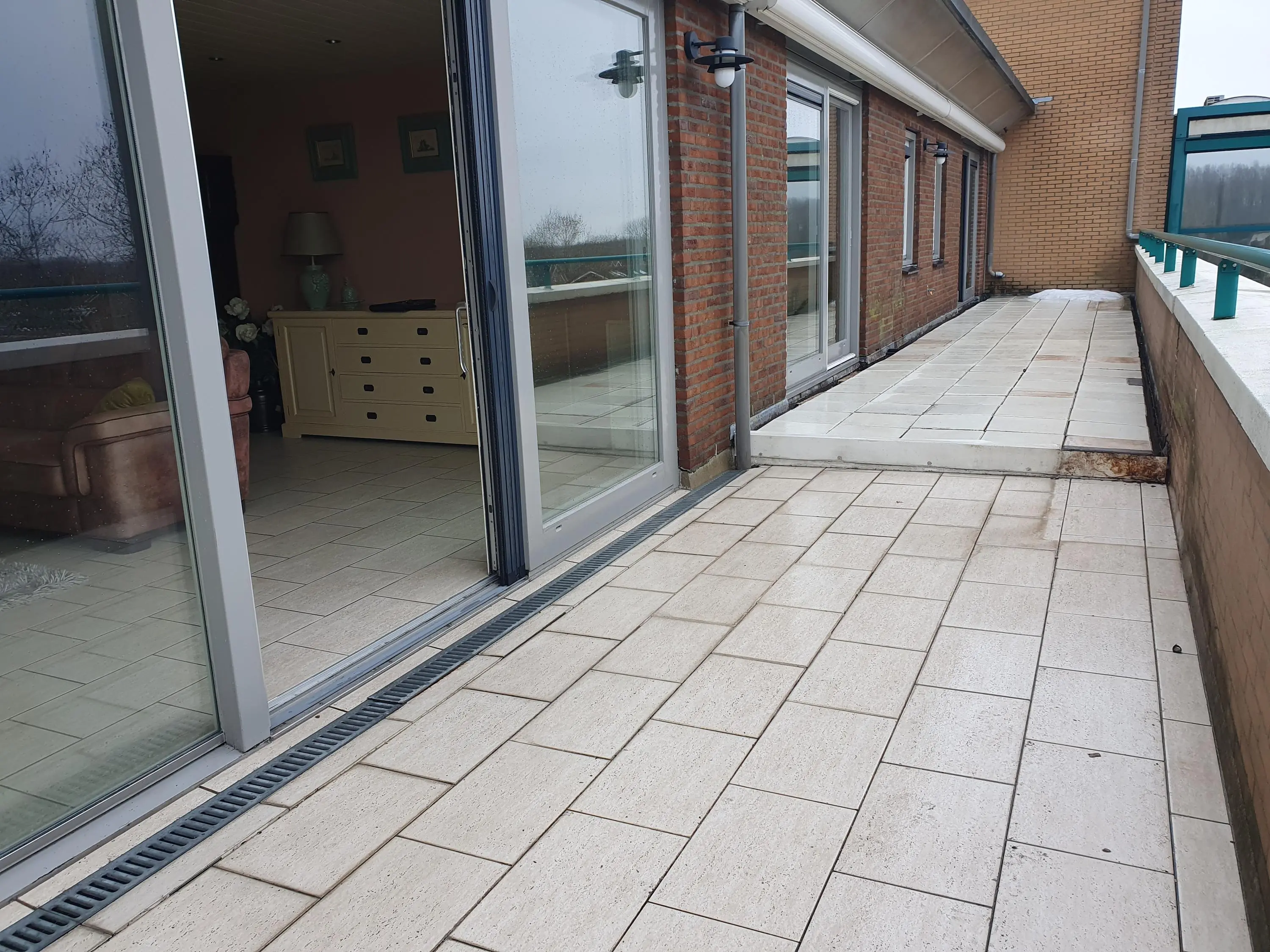 Binnen valt direct de lichte, royale woonkamer op, met grote raampartijen die het daglicht rijkelijk binnenlaten en een prachtig uitzicht bieden over het omringende groen. Vanuit de woonkamer stapt u zo het brede, zonnige terras op het zuiden op – een heerlijke plek om te ontspannen, te dineren of te genieten van de rust en privacy die deze woonlaag biedt.