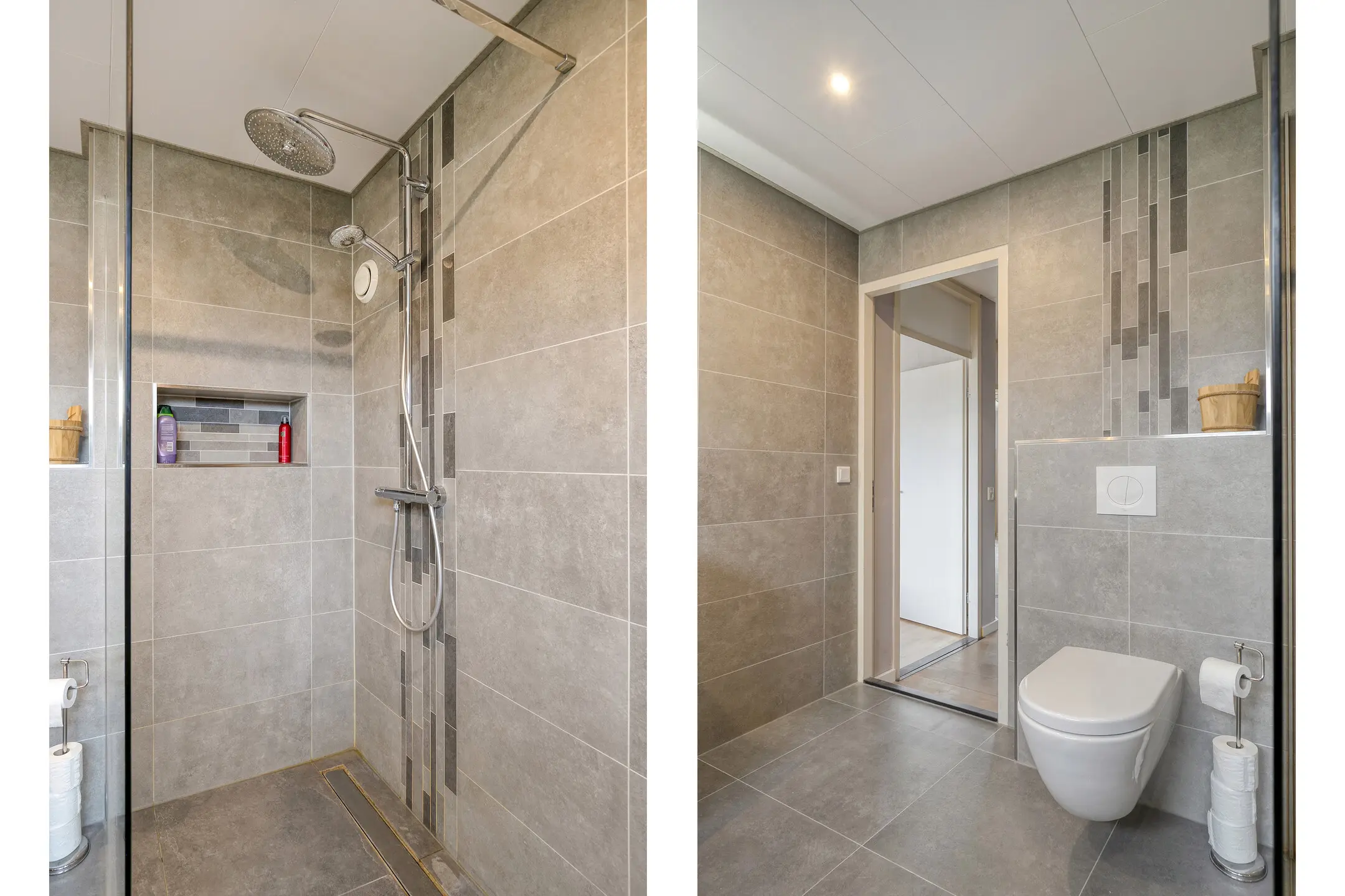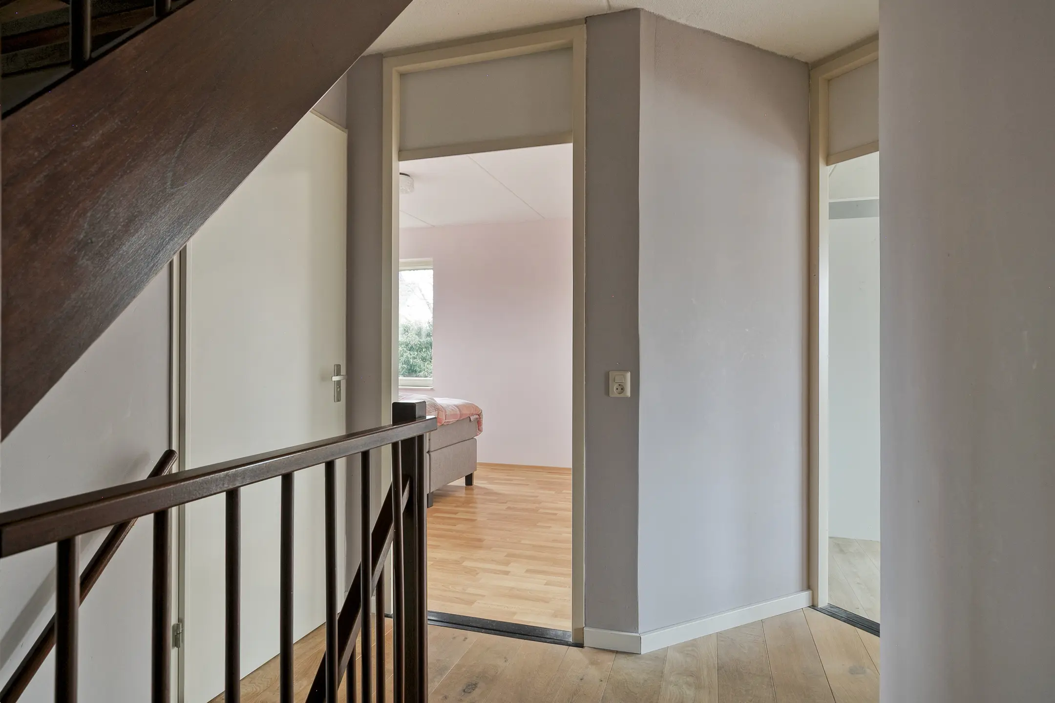 1e verdieping: via een mooie hardhouten trap naar de overloop, 3 slaapkamers en een hobby/slaapkamer boven de garage, badkamer met inrichting uit 2019 van mooie kwaliteit: vloerverwarming, inloopdouche, badmeubel met dubbele wastafel en toilet.