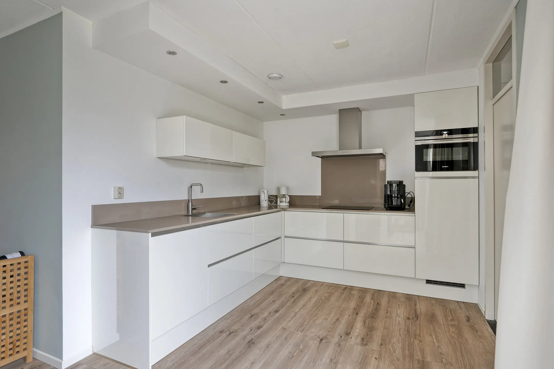 L-woonkamer met zit- en eethoek, mooie strakke open keuken uit 2018 met diverse inbouwapparatuur, bijkeuken met deur naar de tuin, hal/entree met meterkast en toilet.