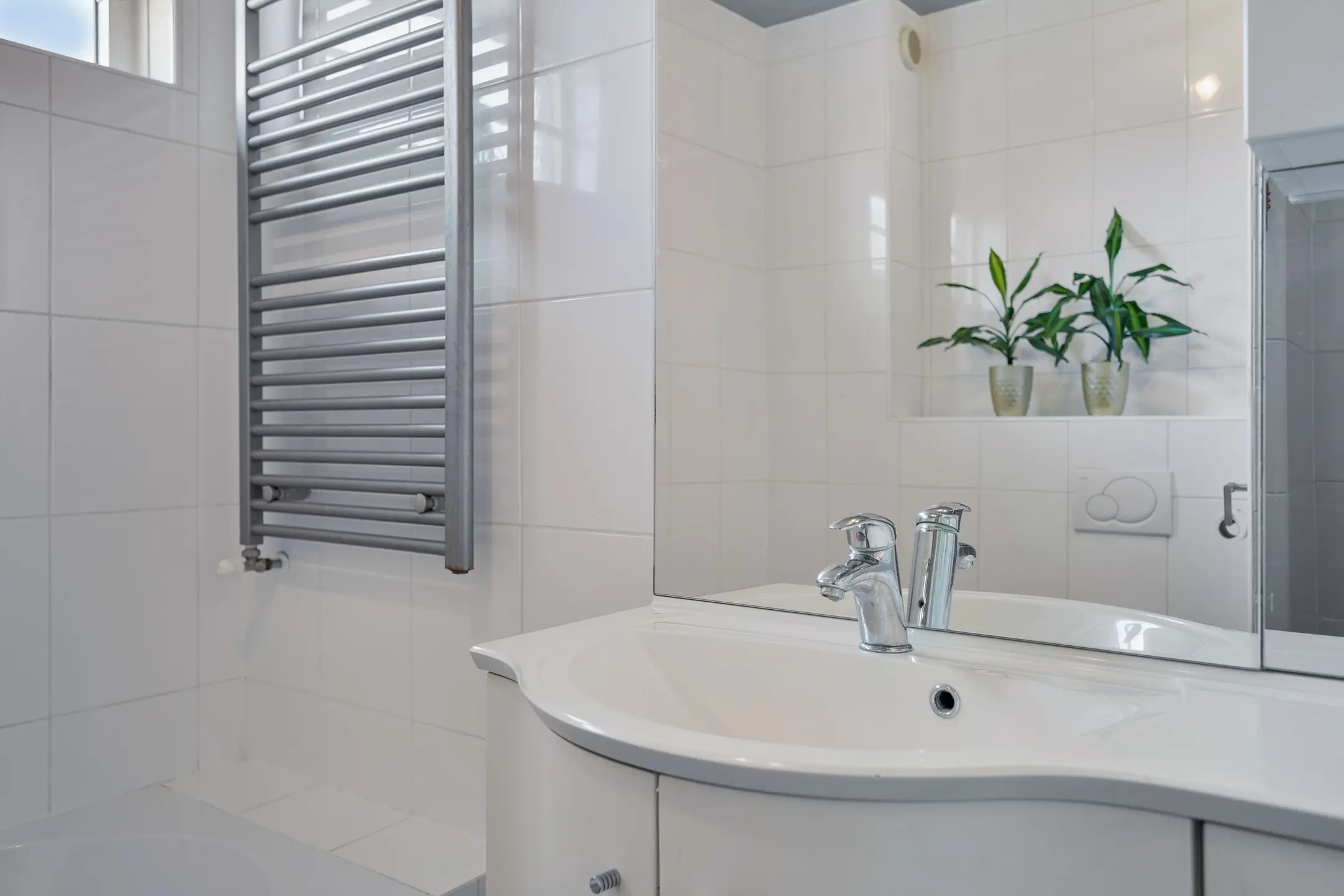 1e verdieping: 2 slaapkamers (voorheen 3), overloop, badkamer met inloopdouche, ligbad en badmeubel met wastafel.