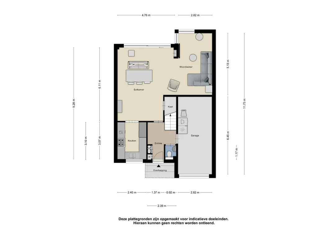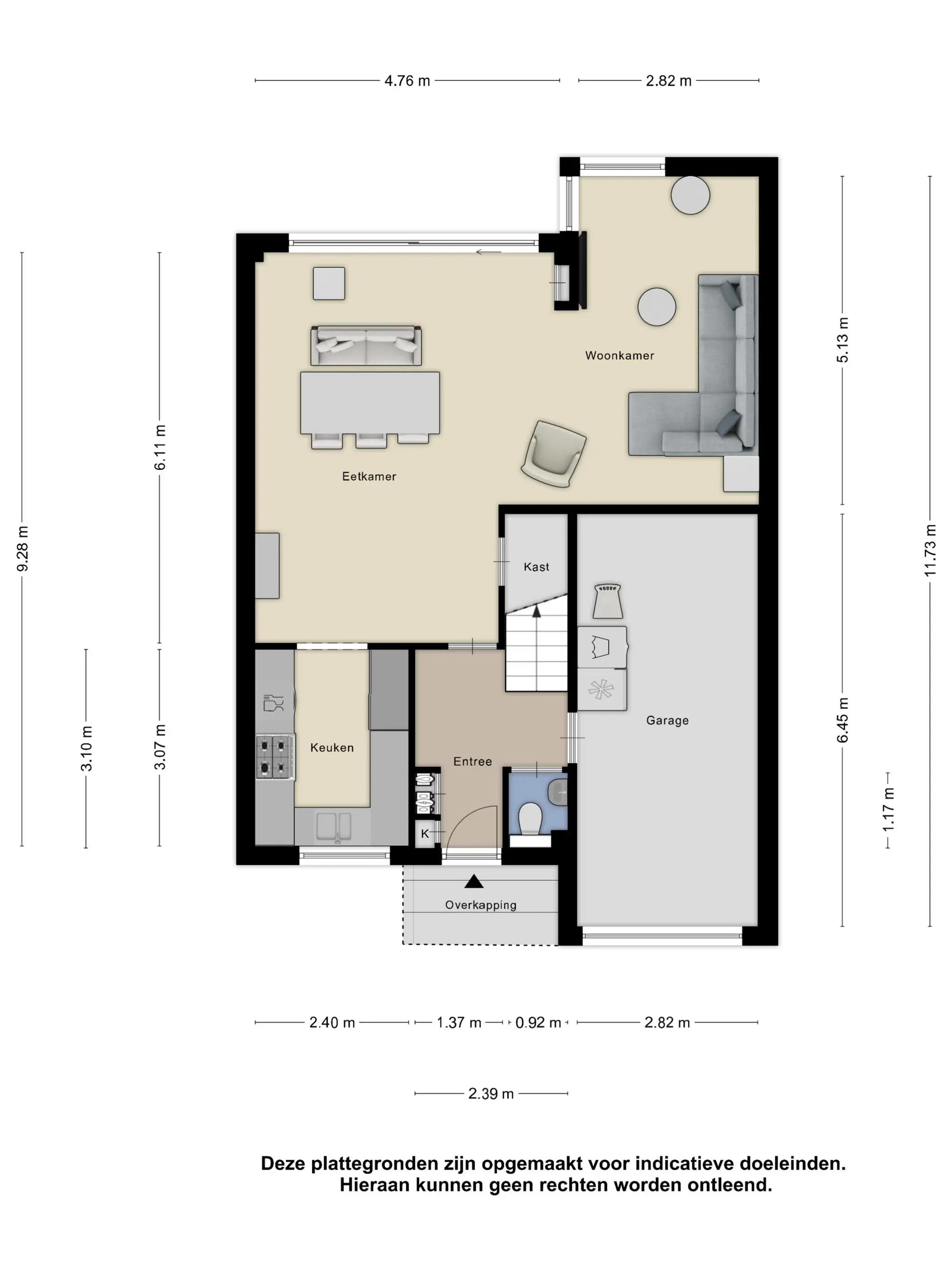 Lichte en ruime woonkamer met deur naar de tuin, keuken met nette inrichting en inbouwapparatuur, hal/entree met toilet, meterkast en deur naar de aanpandige garage.