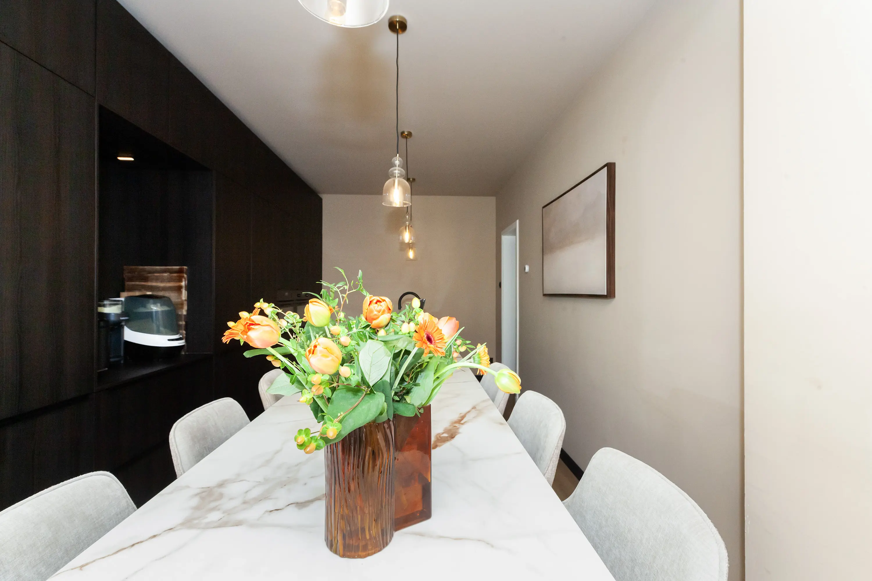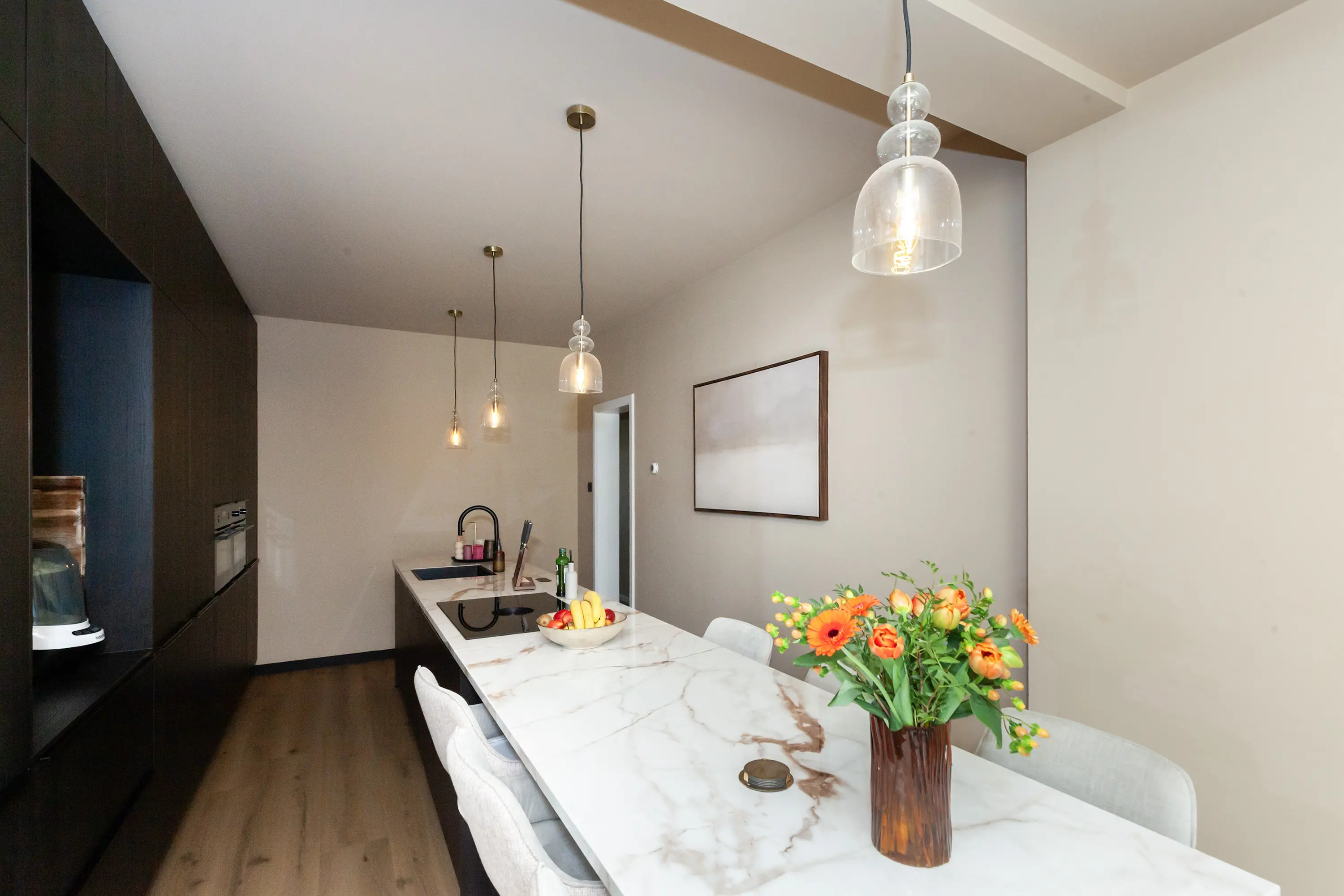 Entree via de gang naar de royale woon-/eetkeuken met kook- en spoeleiland, marmeren werkblad, aangebouwd eetgedeelte en hoogwaardige inbouwapparatuur (AEG en Bora), inclusief wijnklimaatkast, zwarte spoelbak en Quooker.