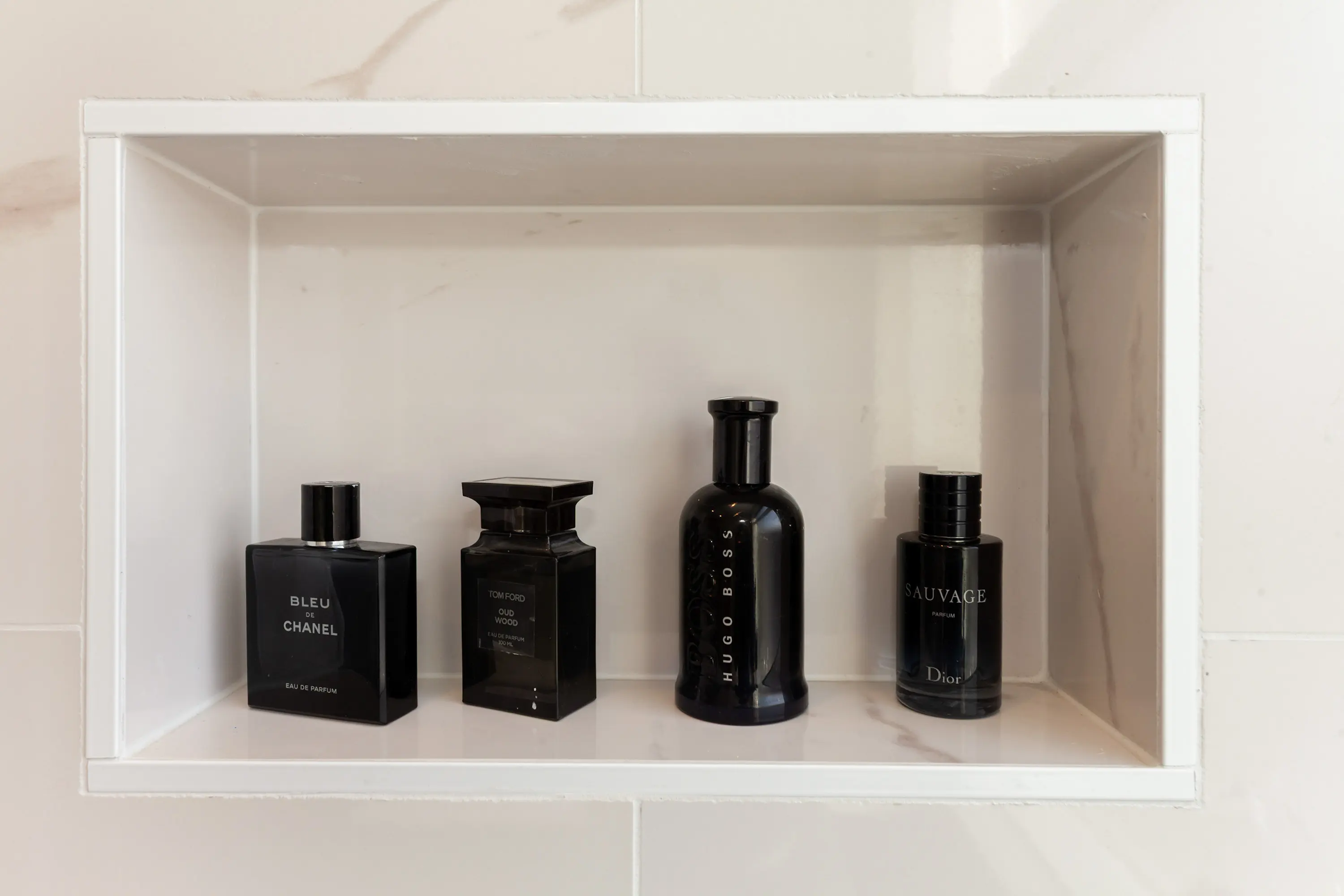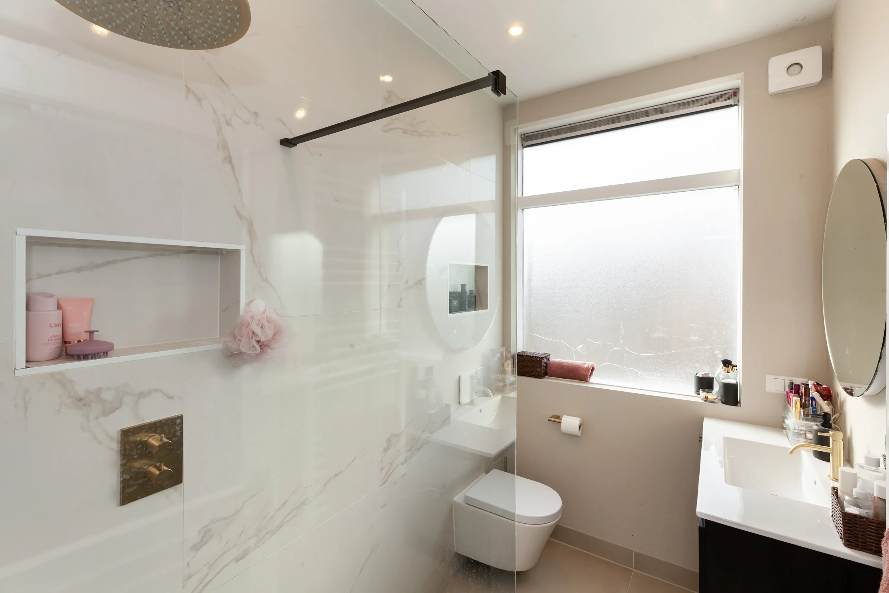 Overloop met toegang tot de luxe badkamer met vloerverwarming, een inloopdouche en breed wastafelmeubel.