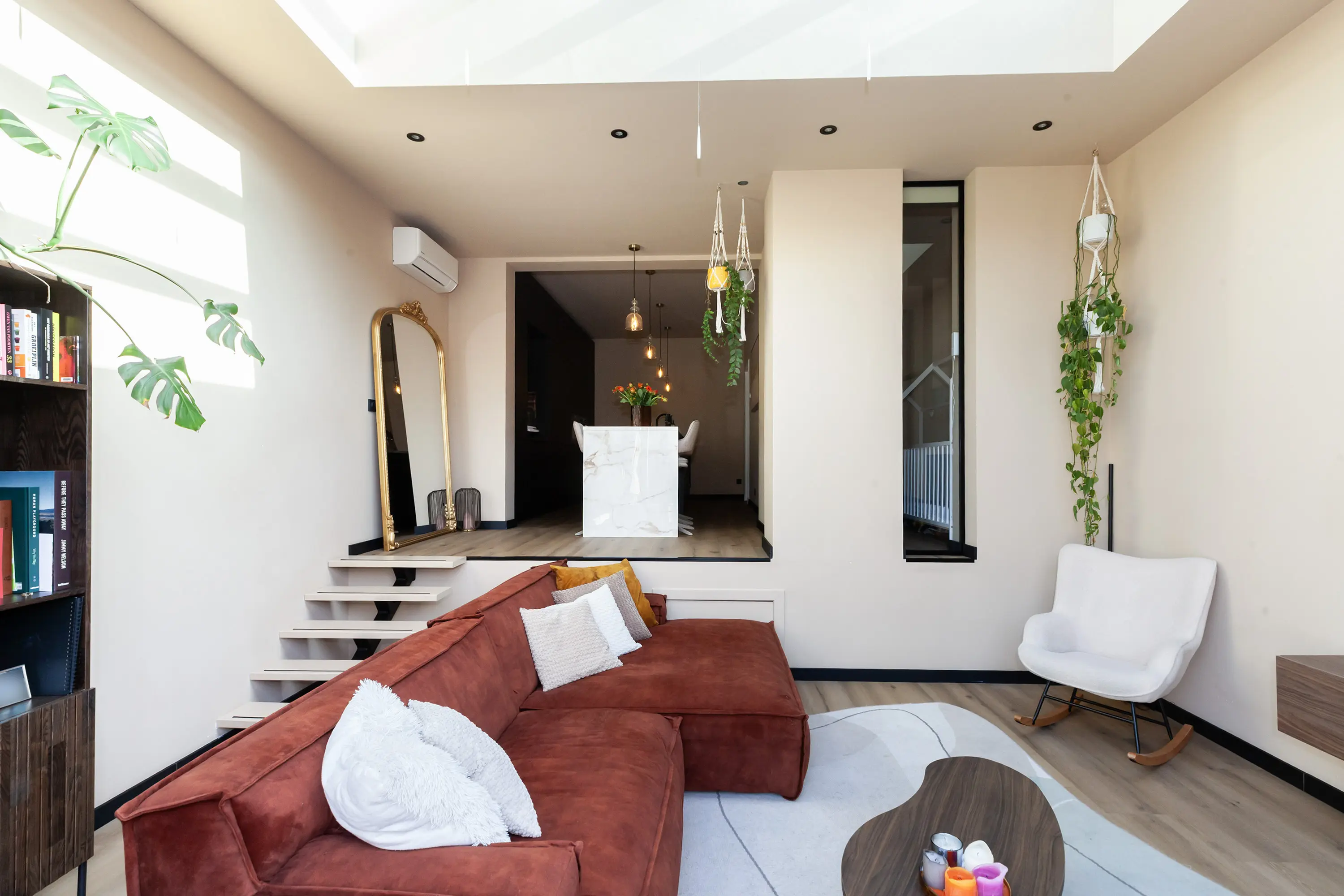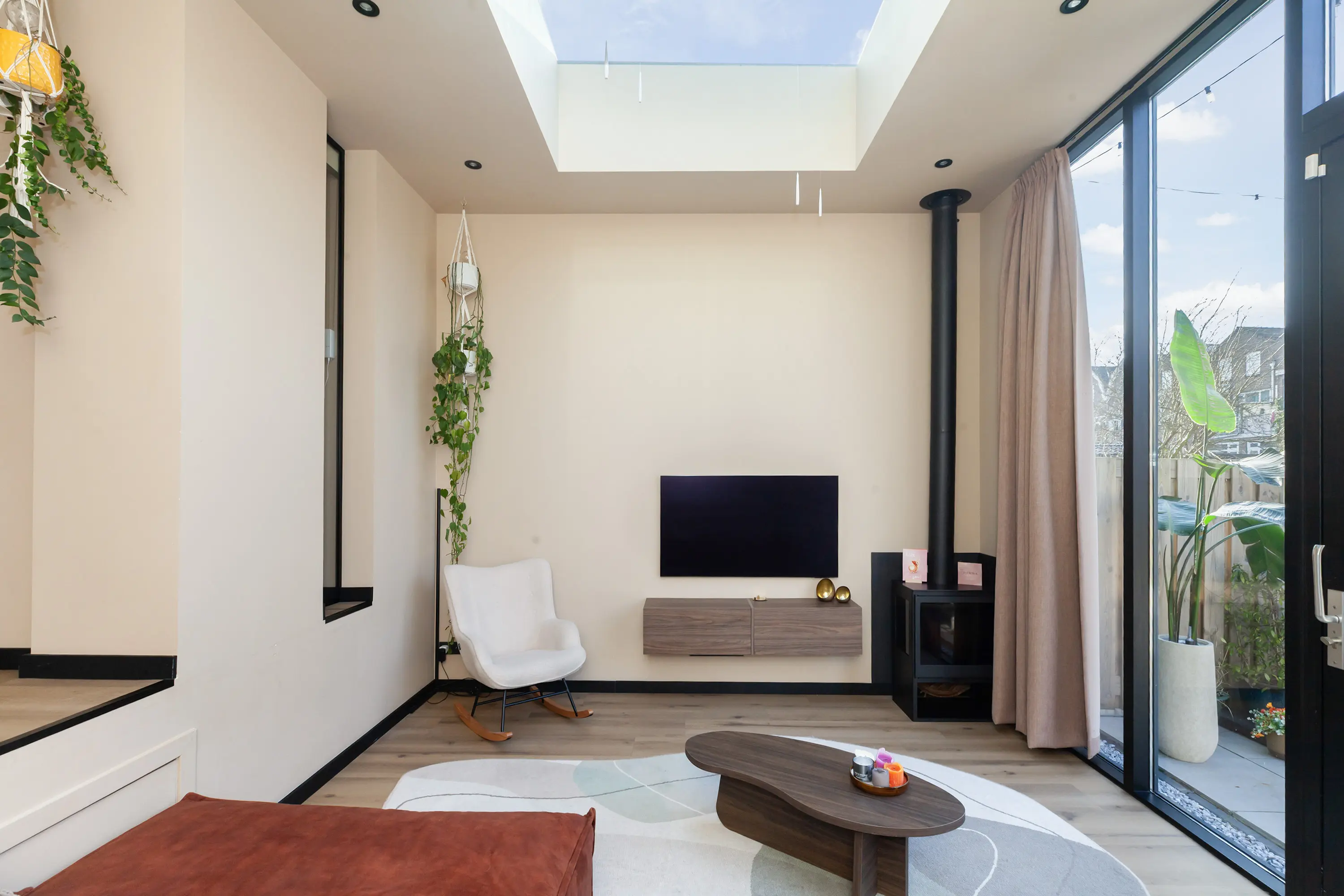 Via een open trap bereik je het lager gelegen, bijzonder sfeervolle zitgedeelte met extra hoog plafond (nokhoogte ca. 3,85 m) en dakramen. De glazen achtergevel met schuifpui verbindt binnen naadloos met de zonnige tuin.