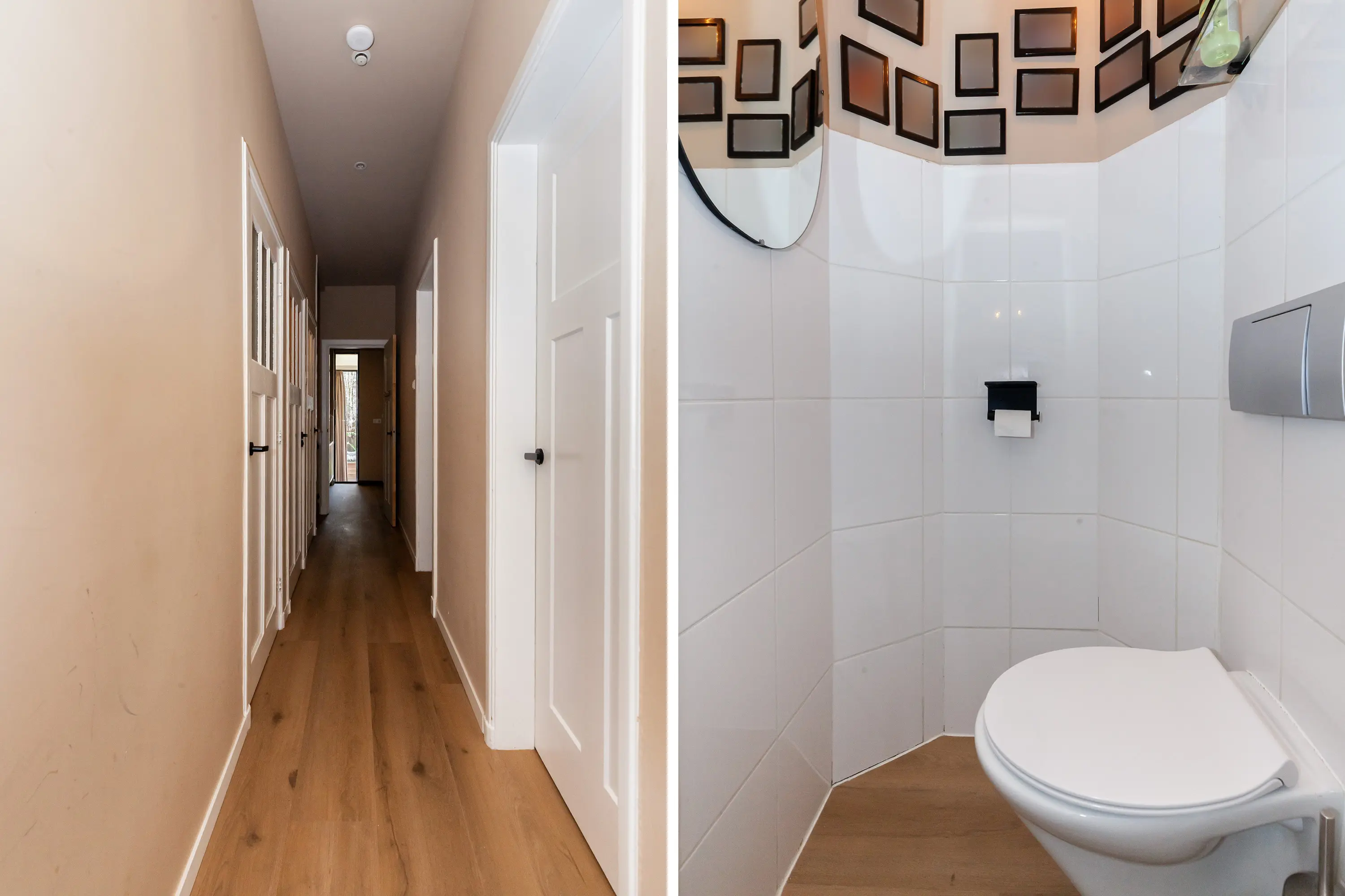 Eigen entree vanaf de straatzijde met hal, garderobe, modern hangtoilet, meterkast en praktische kast met wasmachine- en drogeraansluiting.