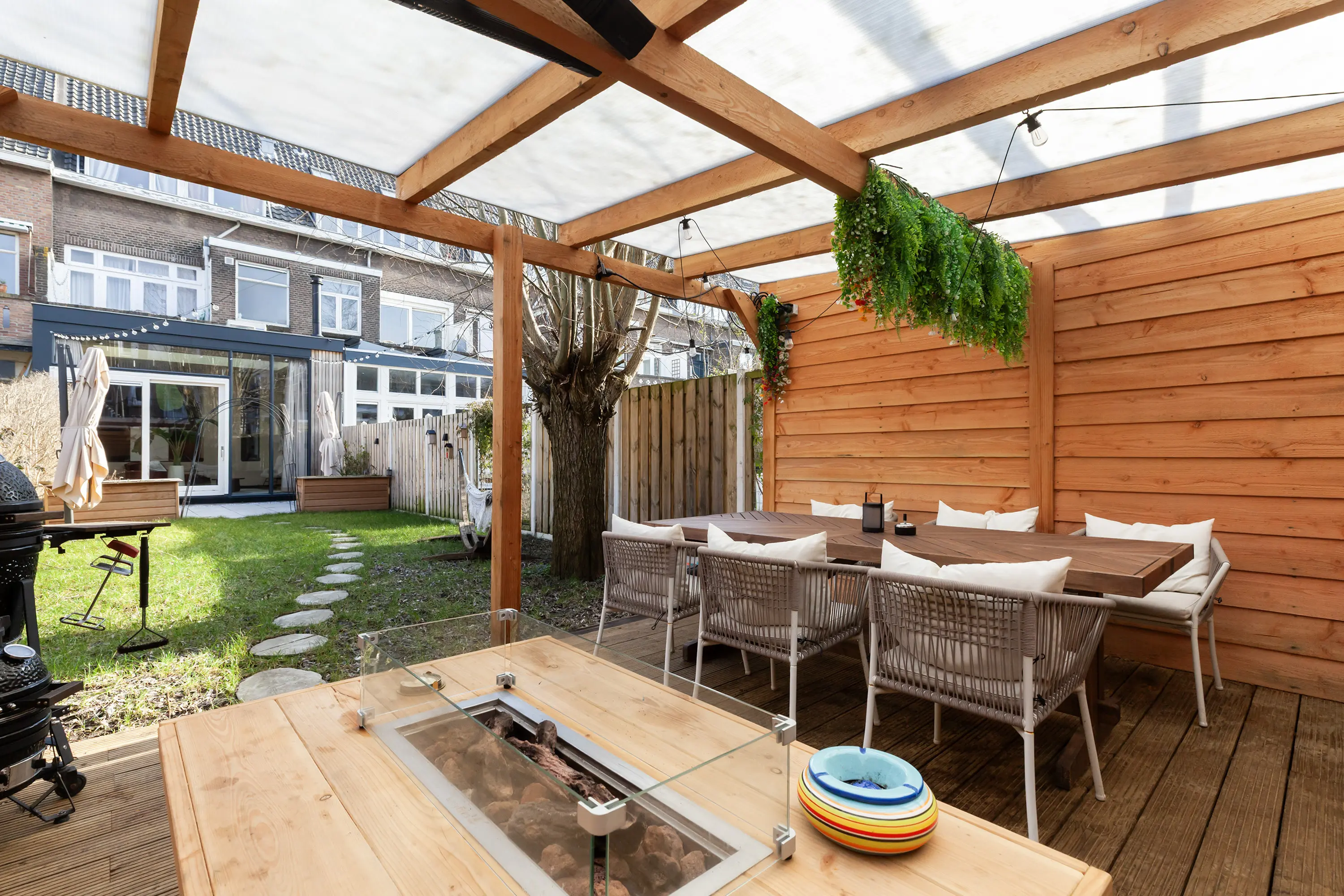 De diepe, verzorgd aangelegde tuin ligt gunstig op de zon en beschikt over meerdere zitplekken en een luxe overkapping met ingebouwde TV, ideaal voor lange zomeravonden en ontspannen buitenleven.