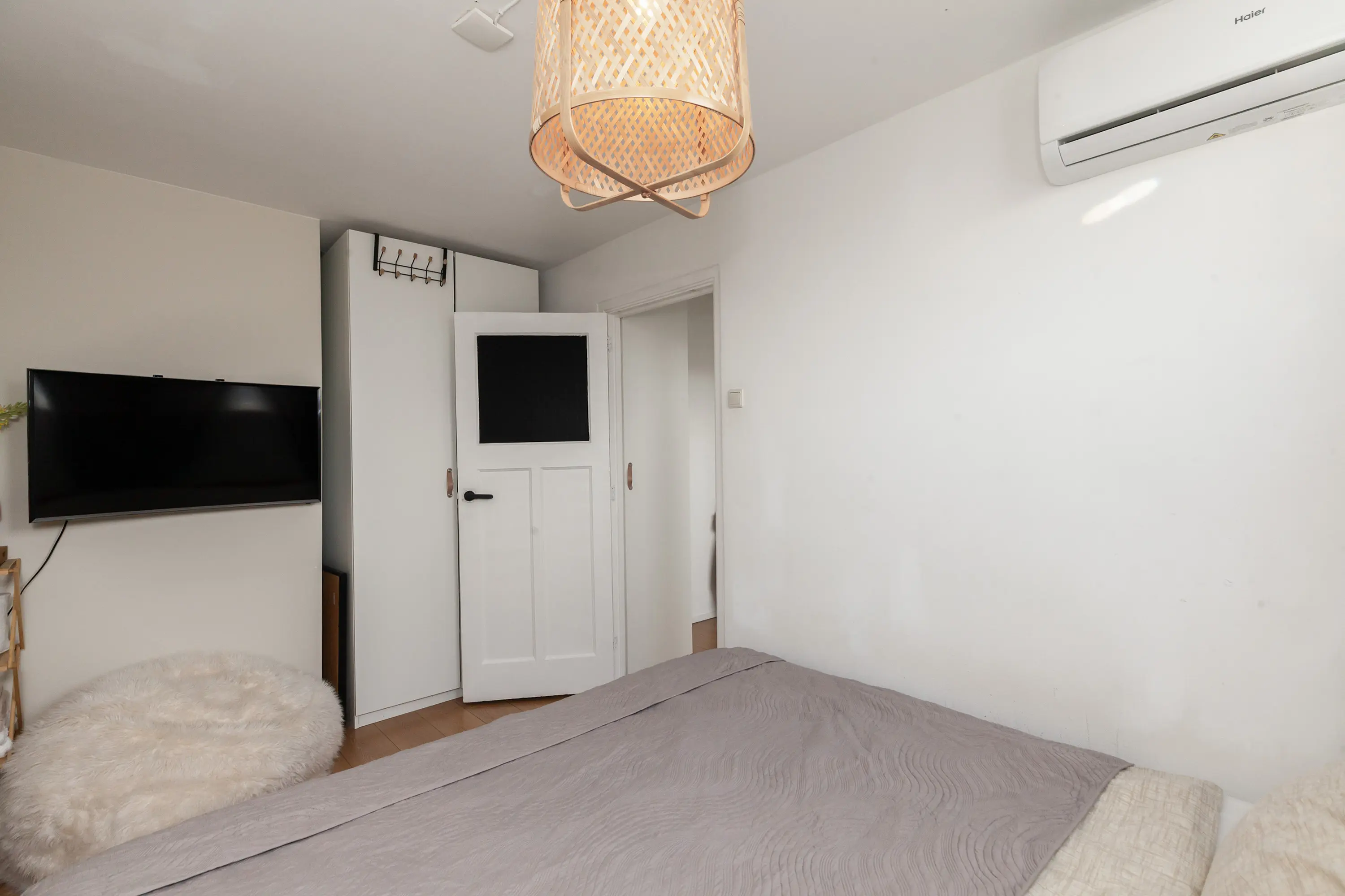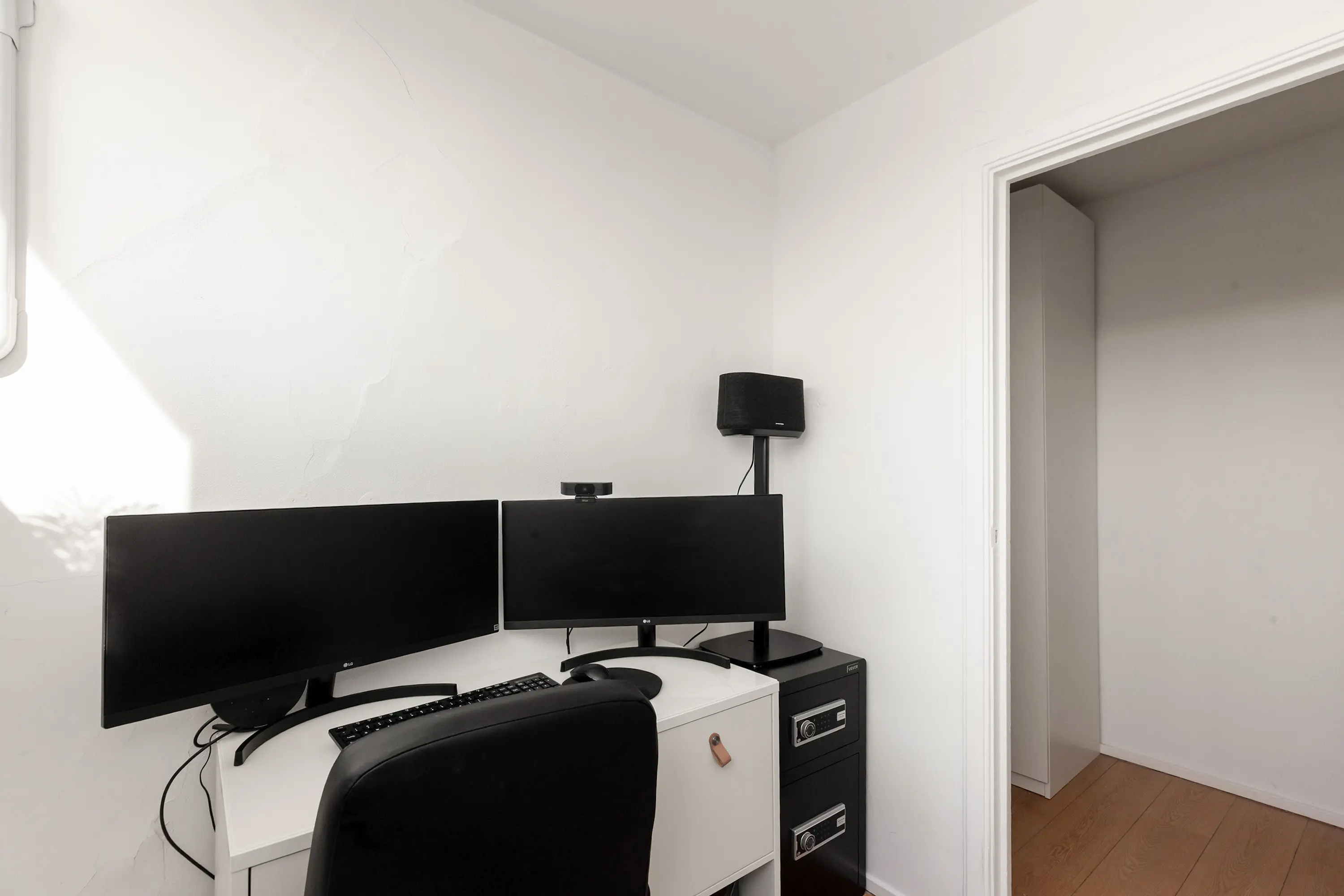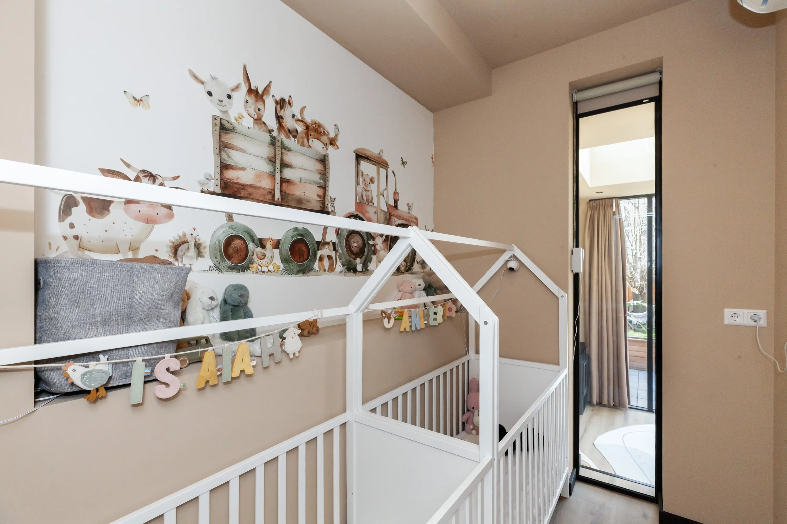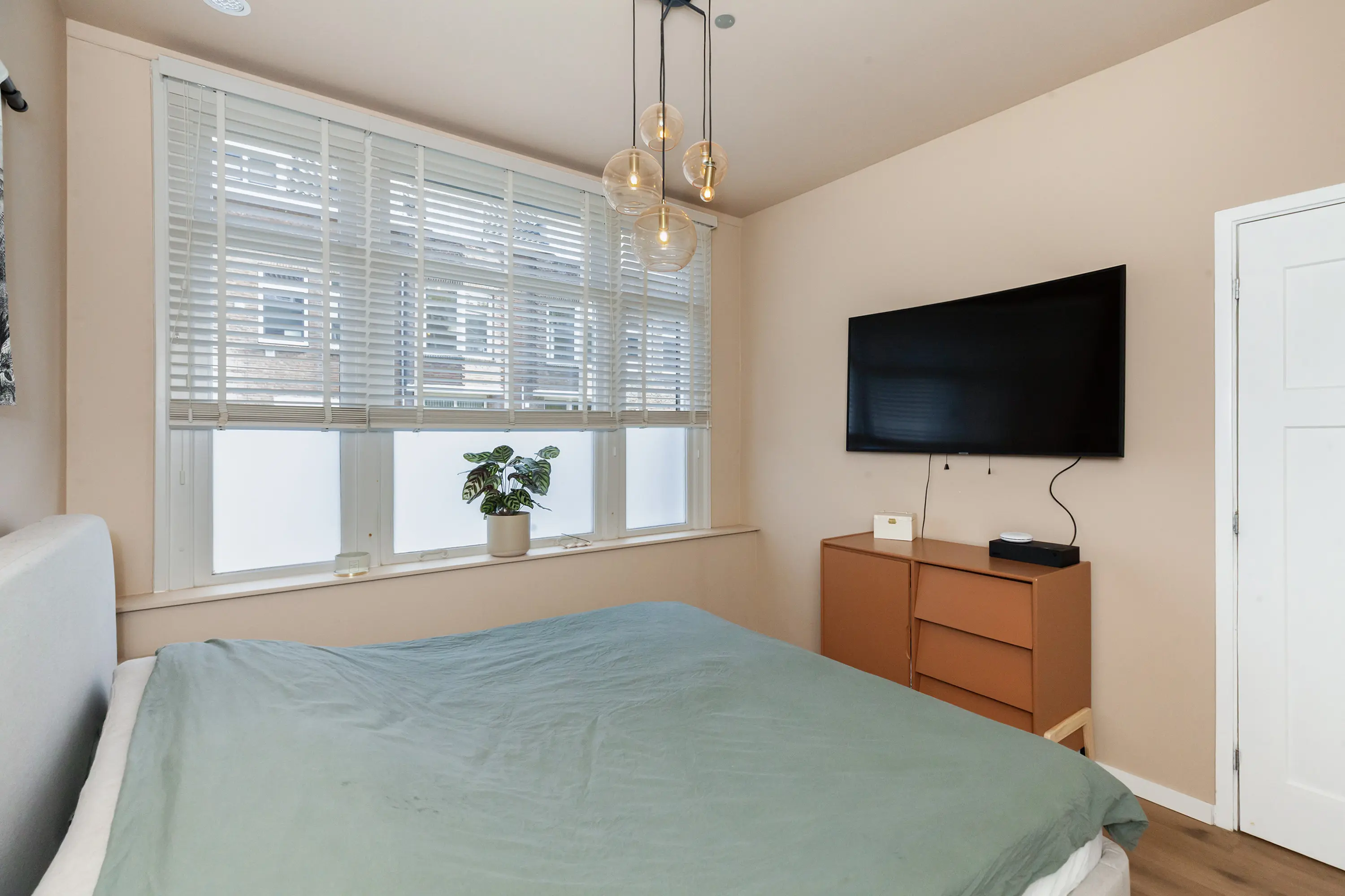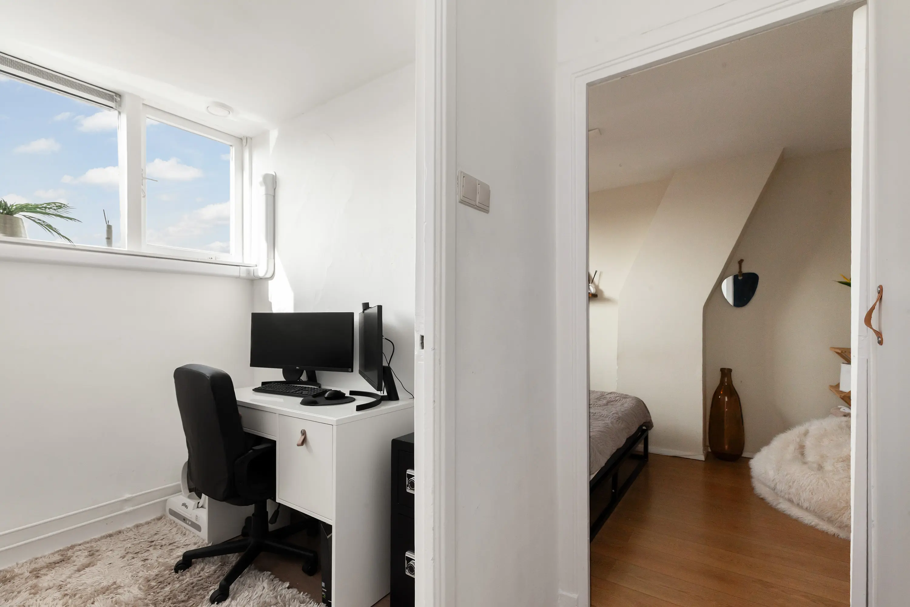 Aan de voorzijde bevindt zich een ruime slaapkamer met kastenwand. Vanuit de gang is tevens een extra (kinder)kamer of kantoor bereikbaar met doorkijk naar het woongedeelte.