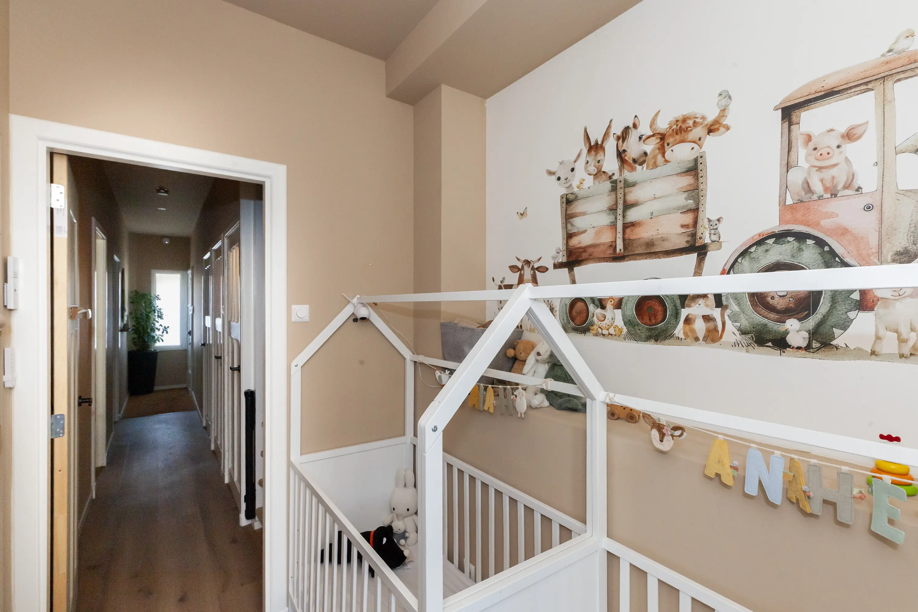 De verdiepingen zijn voorzien van laminaatvloeren; de trappen zijn bekleed.