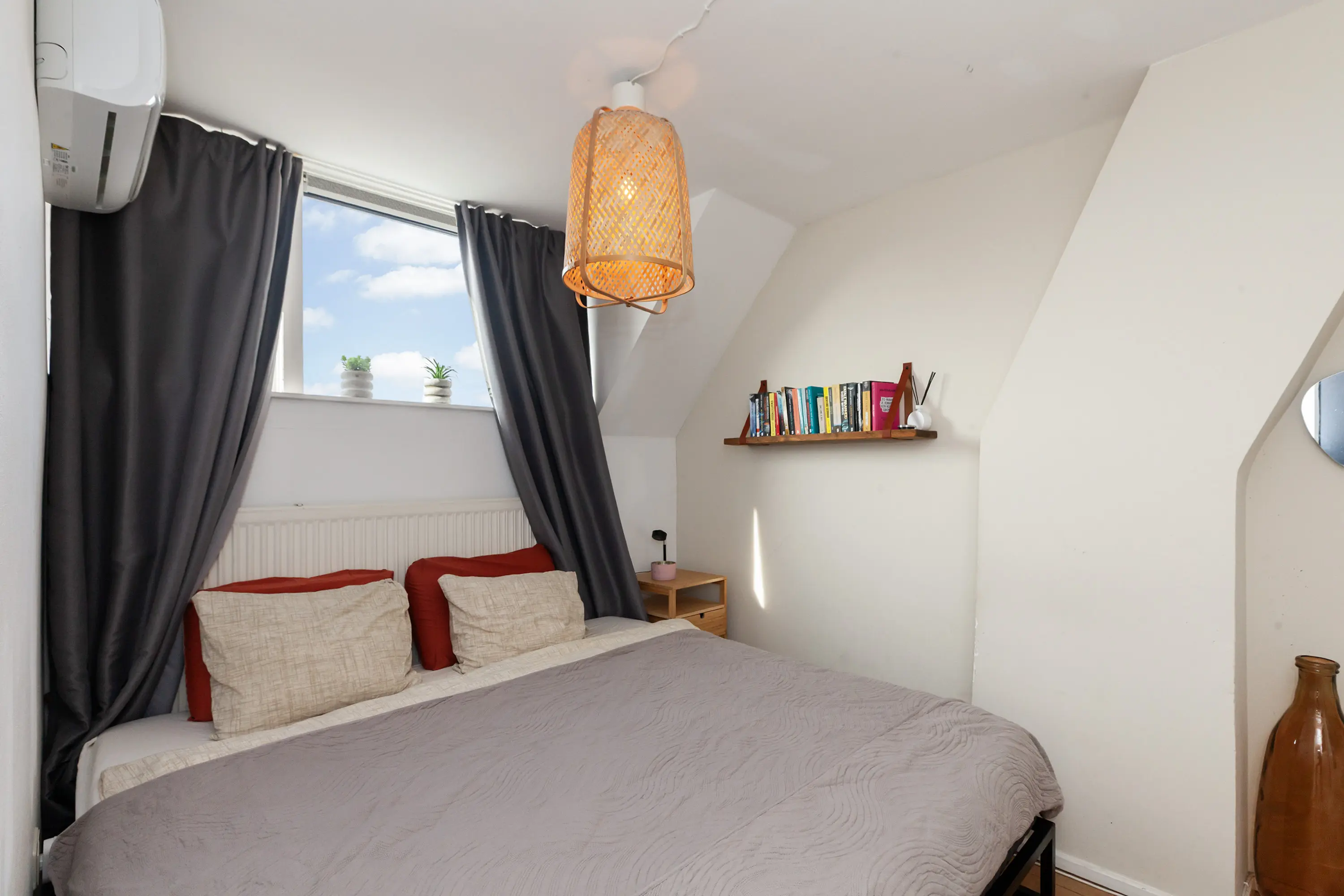 Slaapkamer met dakkapel, werk-/logeerkamer met cv-opstelling, overloop.