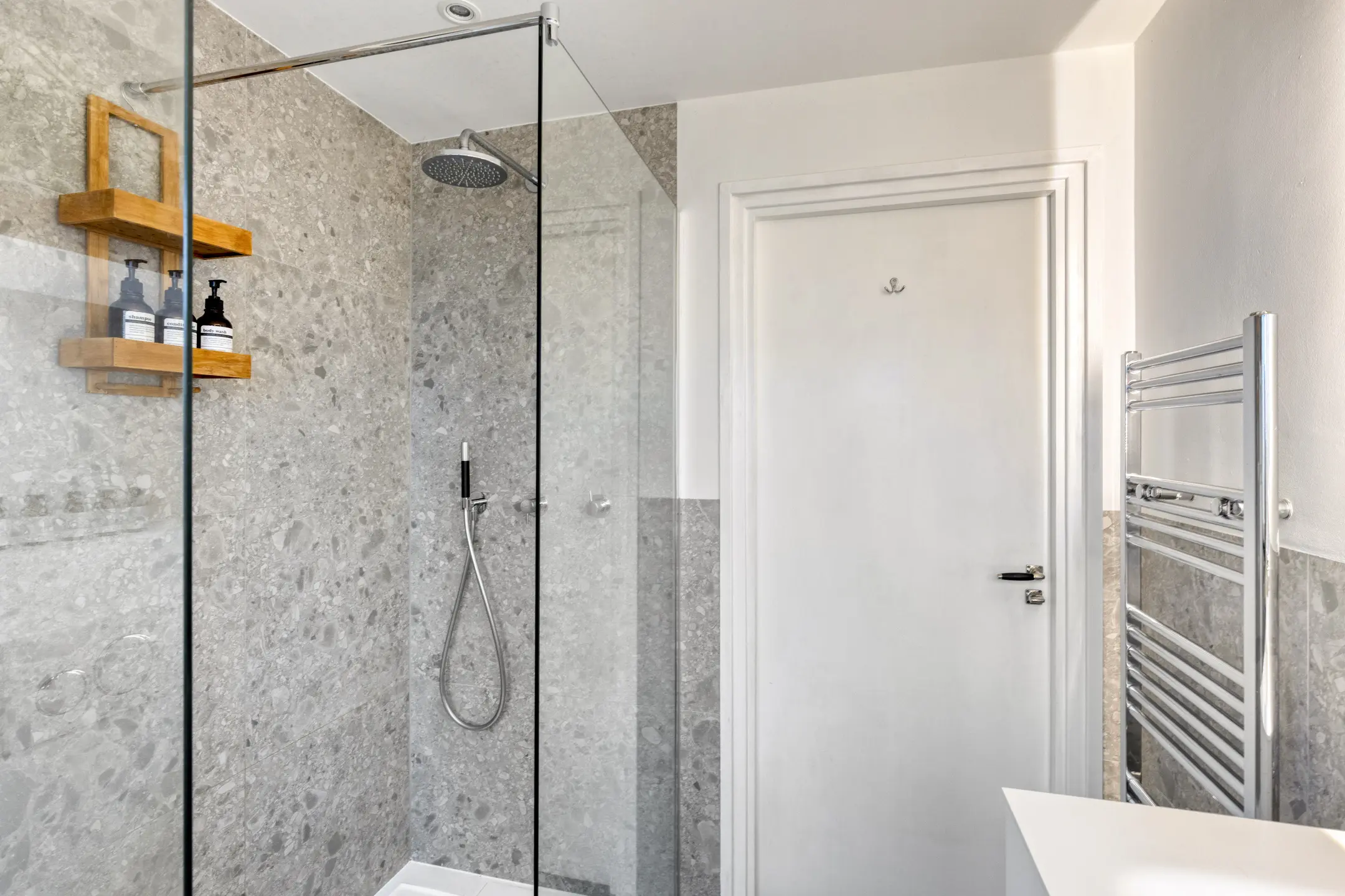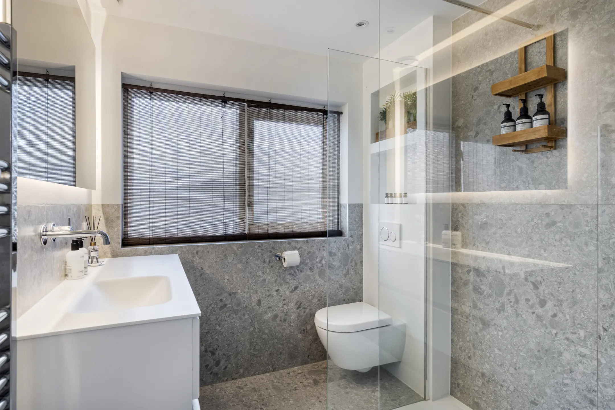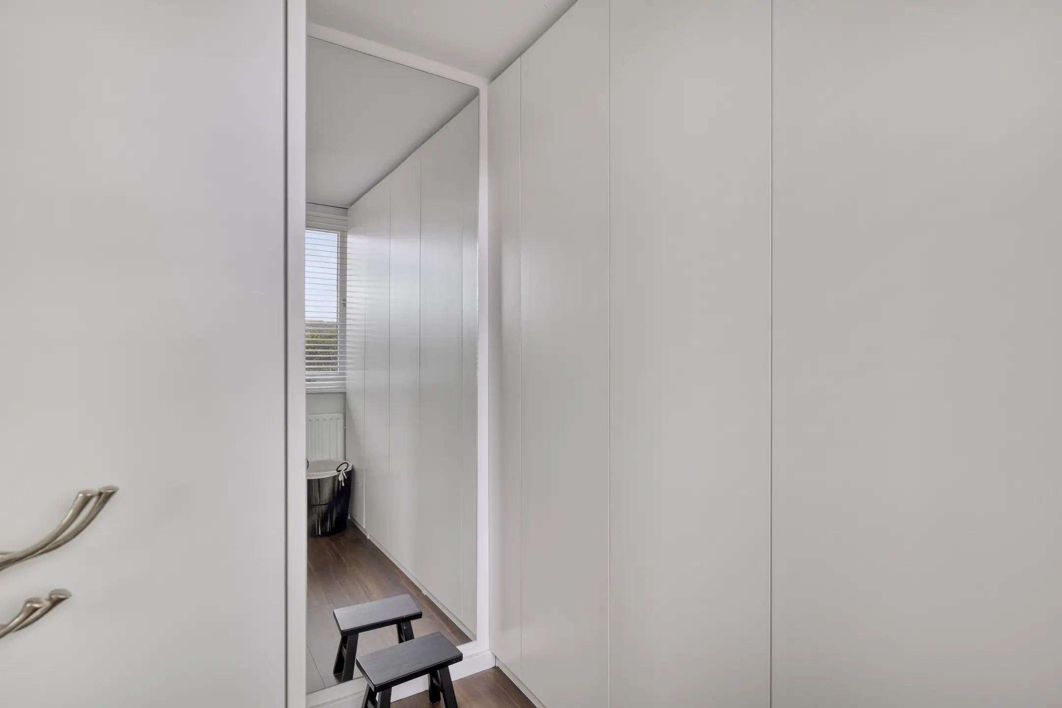 1e verdieping: ruime masterbedroom met aangrenzende inloopkast (voorheen slaapkamer), 2e slaapkamer, badkamer met inloopdouche, toilet en badmeubel, overloop met bergkast.