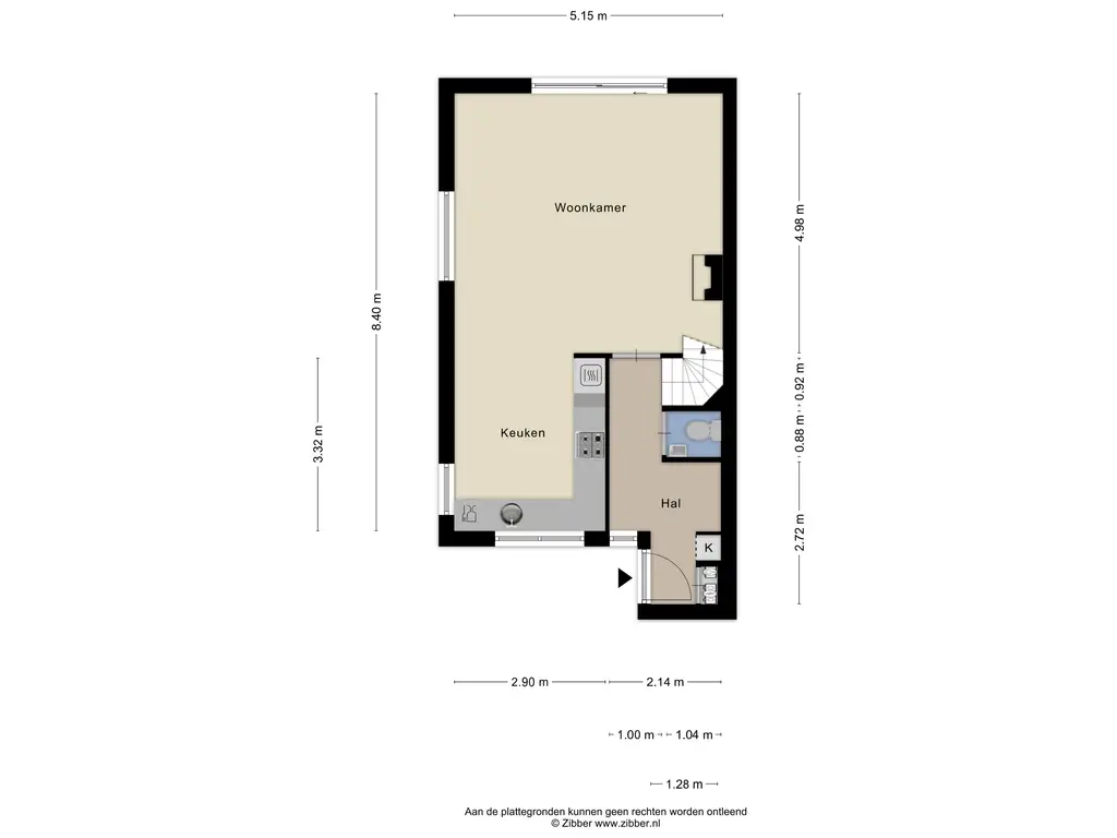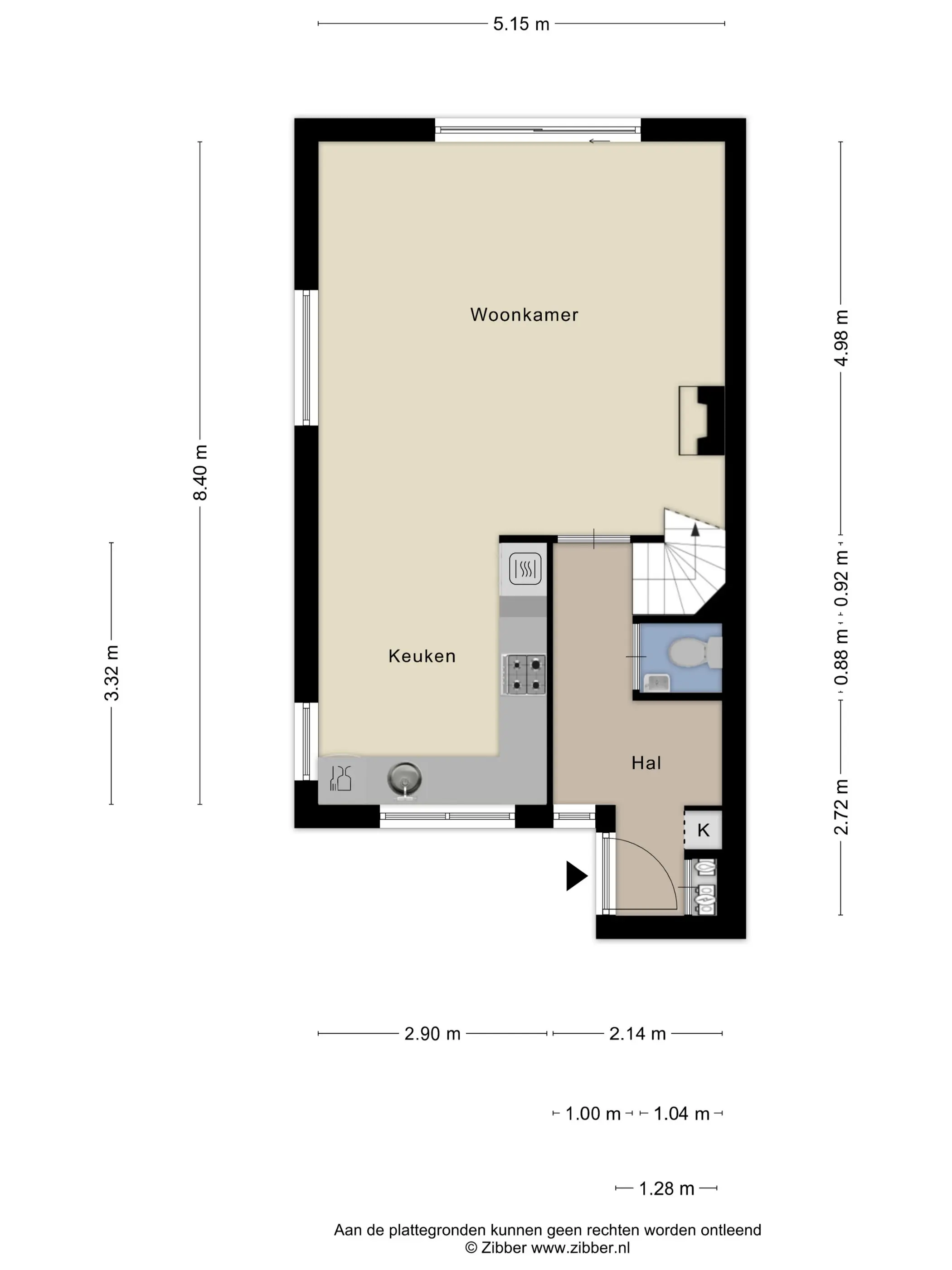 Woonkamer met schuifpui naar de tuin, open keuken met ruime L-inrichting en diverse inbouwapparatuur, hal met toilet en meterkast.