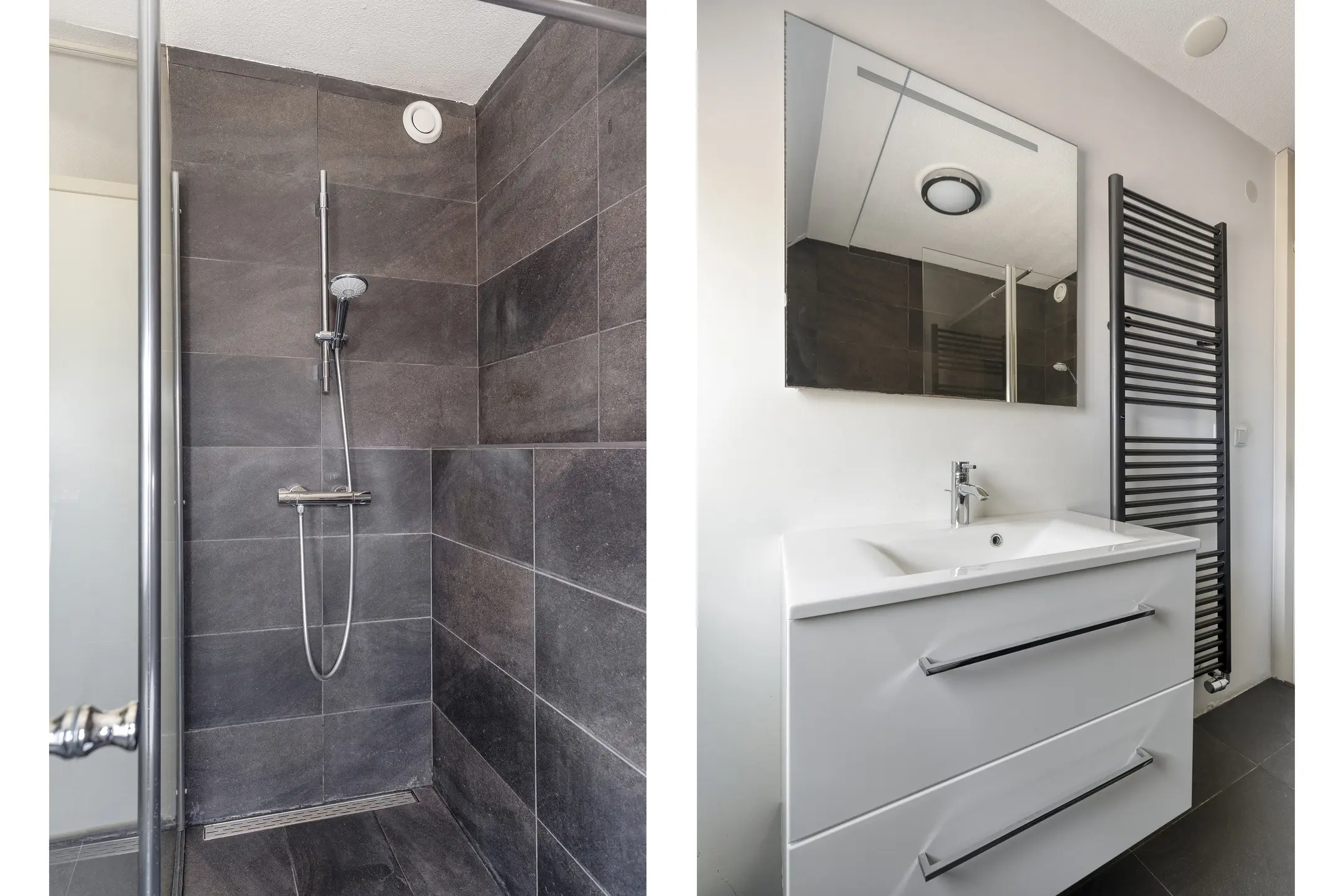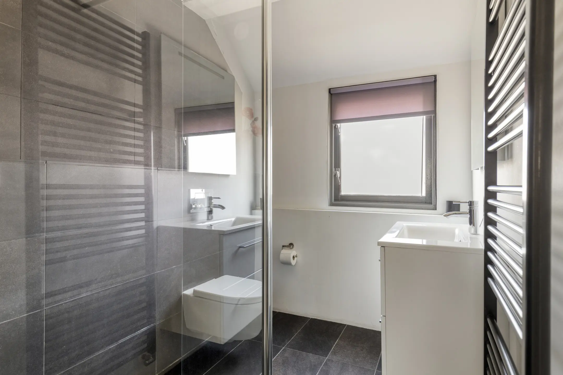 1e verdieping: 2 royale slaapkamers (voorheen 3), overloop, badkamer met inloopdouche, wastafel en toilet.