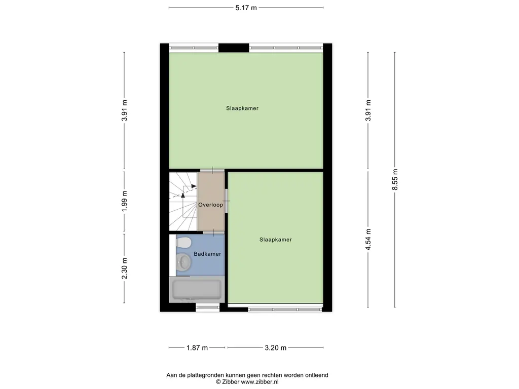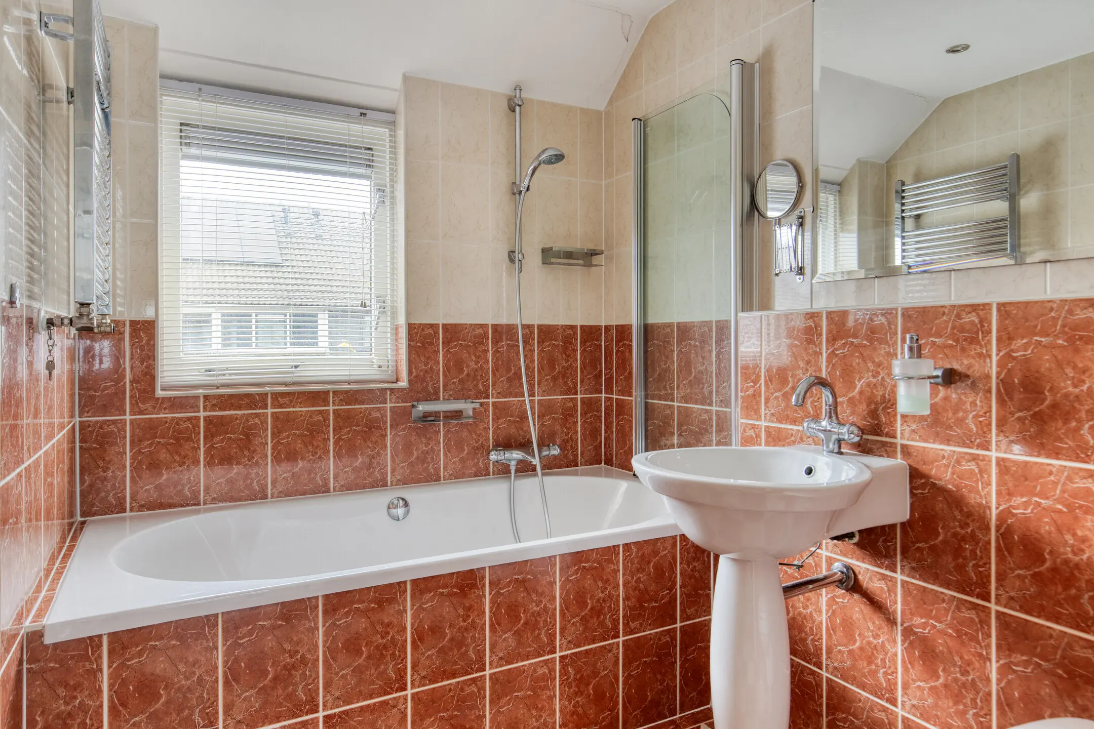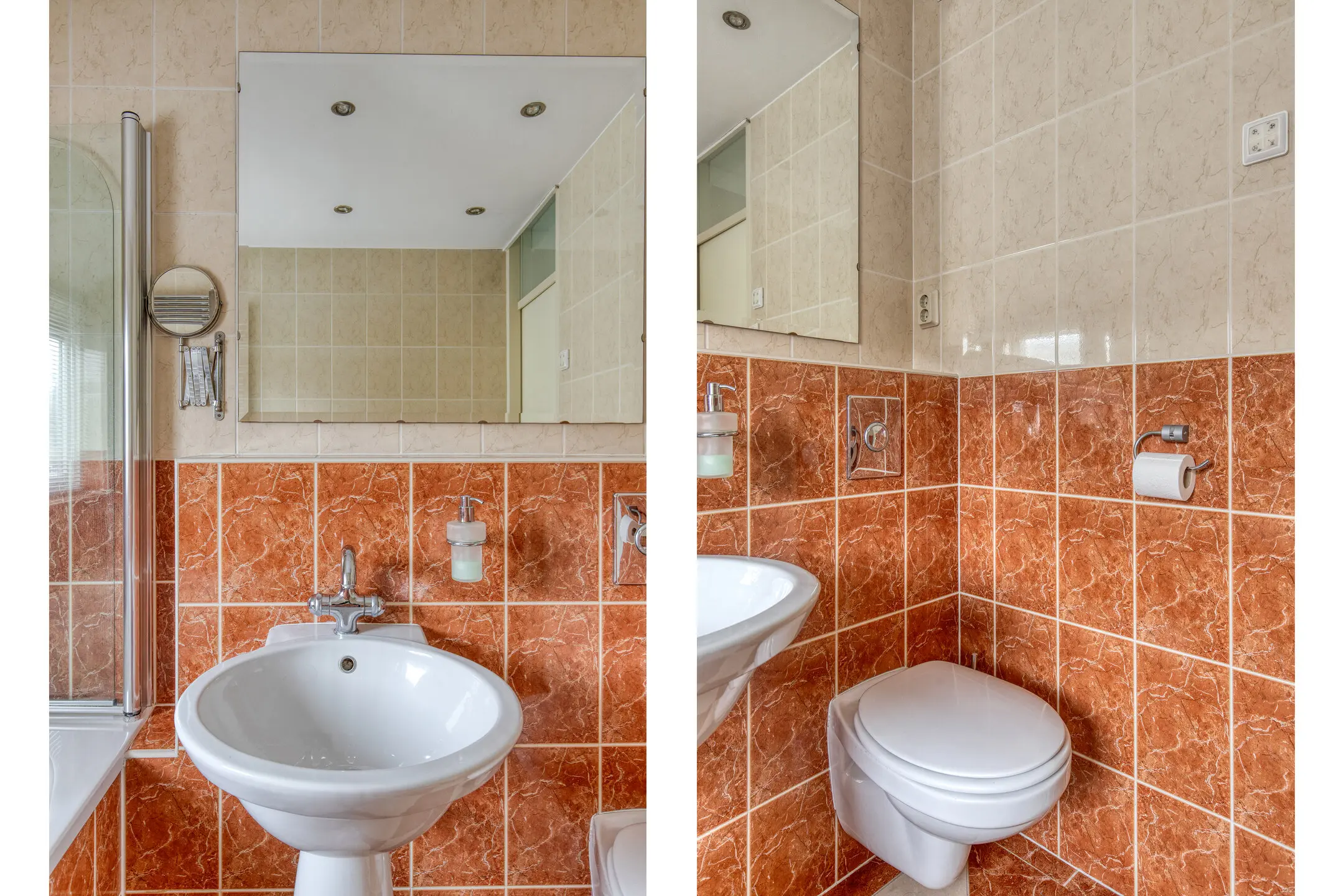 1e verdieping: 2 ruime slaapkamers (voorheen 3), overloop, badkamer met nette inrichting voorzien van o.m. ligbad, douche, wastafel en toilet.